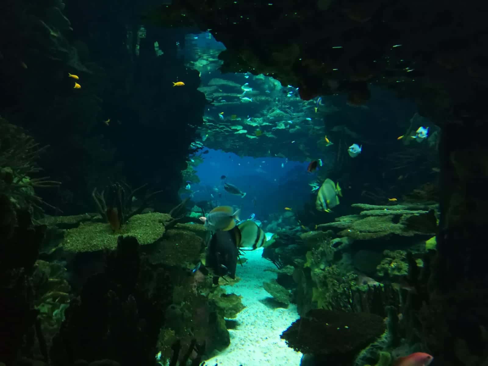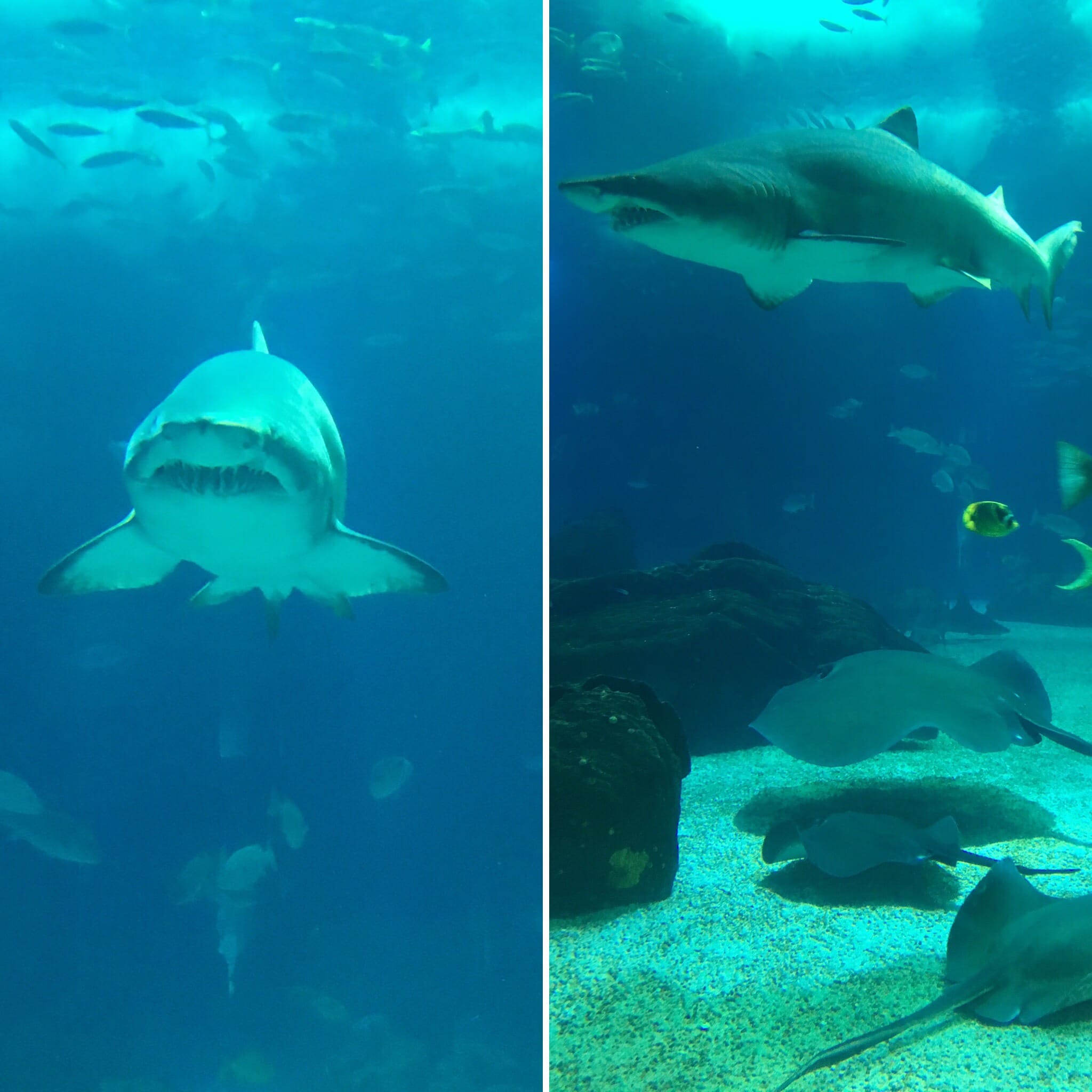 Zwiedzanie kontynuujemy w kolejnym budynku, składającym się z ogromnego akwarium i 4 mniejszych akwariów. Centralne akwarium podzielone jest na kilka części (sprytnie oddzielonych ogromnymi skałami), z wodą o różnej temperaturze, co pozwala na obserwowanie pingwinów, a w oddali rekinów… Można obserwować akwarium na 2 piętrach i z małych cichych zakątków