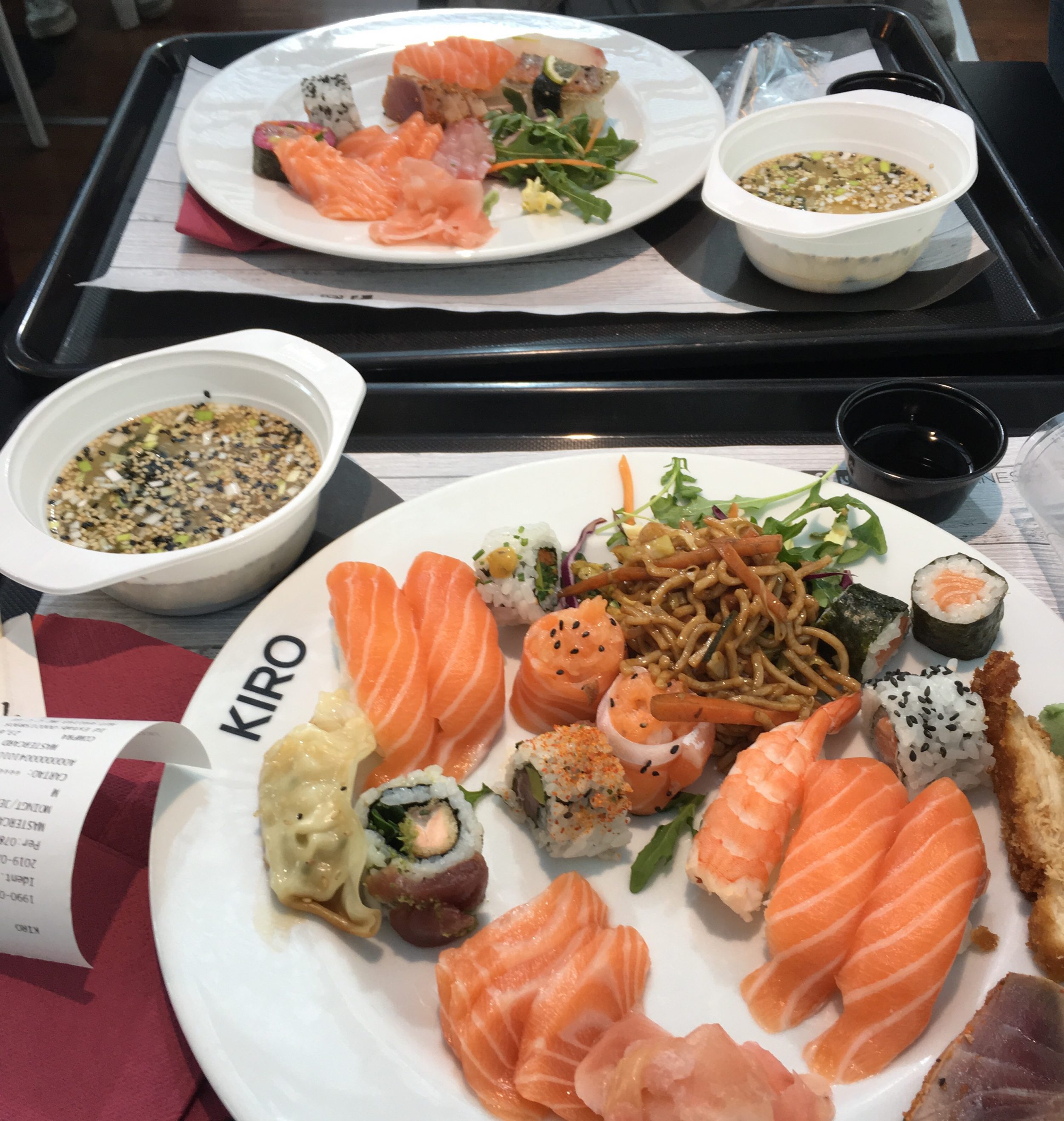 My decydujemy się na lunch na ostatnim piętrze, gdzie można wybrać i zapłacić za sushi na wagę (2,90 € za 100 gramów). Mamy 24€ za dwie osoby, jest świeże i bardzo dobre. Zatwierdzam!