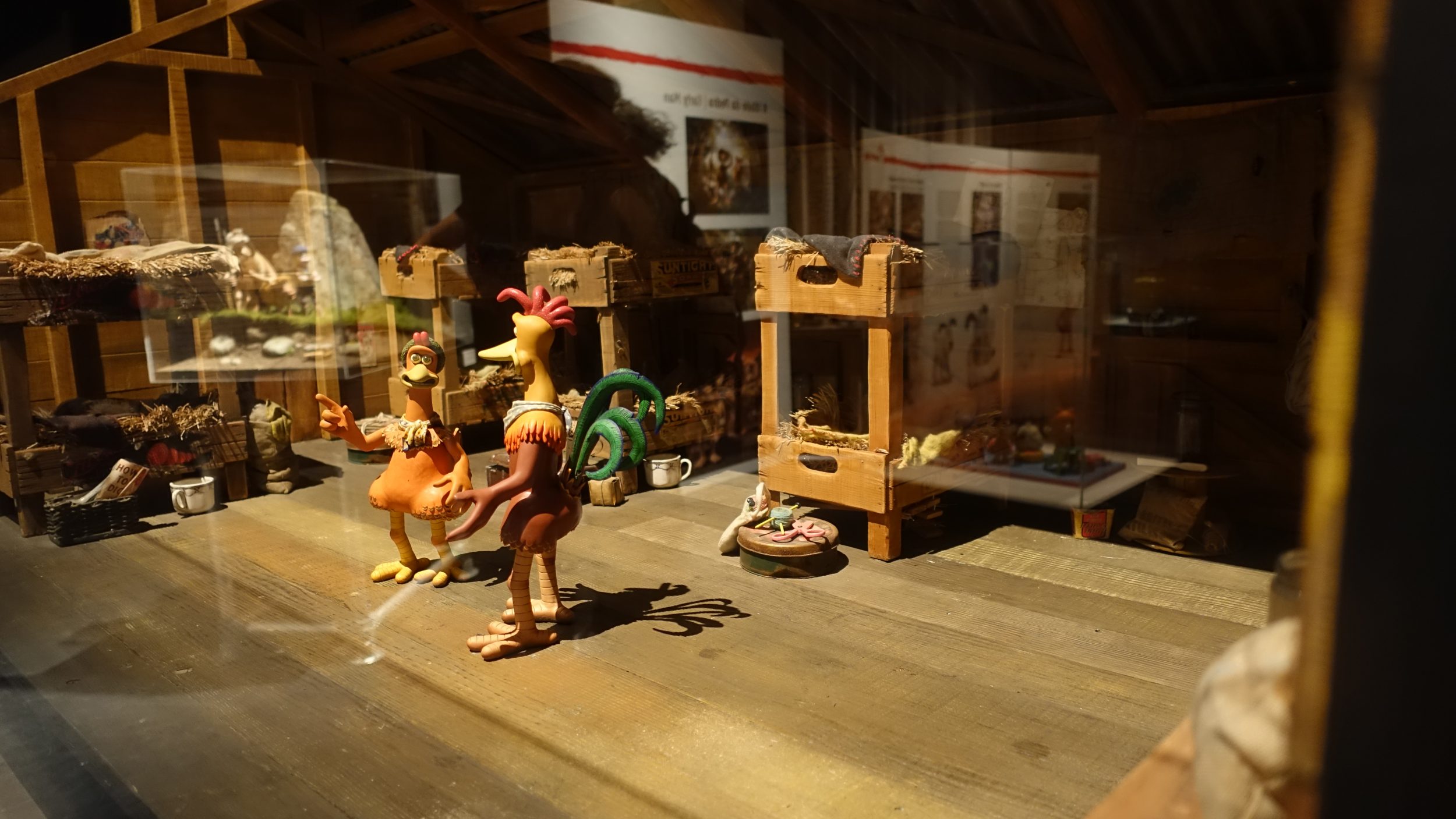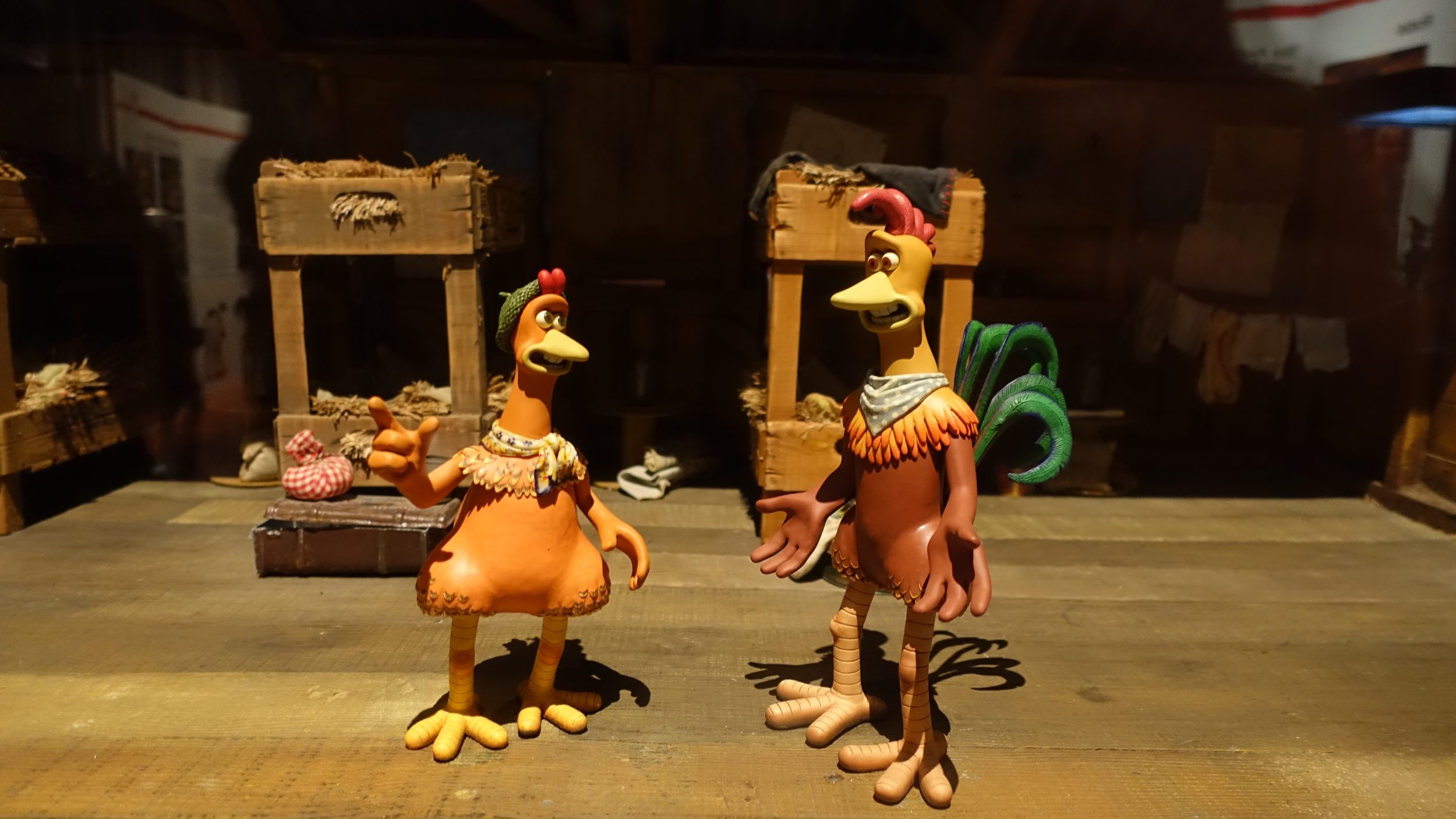 Chicken Run, światowy sukces, nie jest już prezentowany. Tutaj mamy tylko jeden zestaw, ale jeśli spojrzeć na małe szczegóły, to jest to naprawdę zabawne. Na przykład, mają grę w rzutki z facetem, który przychodzi po jajka każdego dnia jako cel. Albo, skoro szukają ucieczki, w kurniku leżą dwa magazyny „jak kopać” 😀 Jest też autoportret narysowany przez kurę w kurniku. To jest super słodkie!