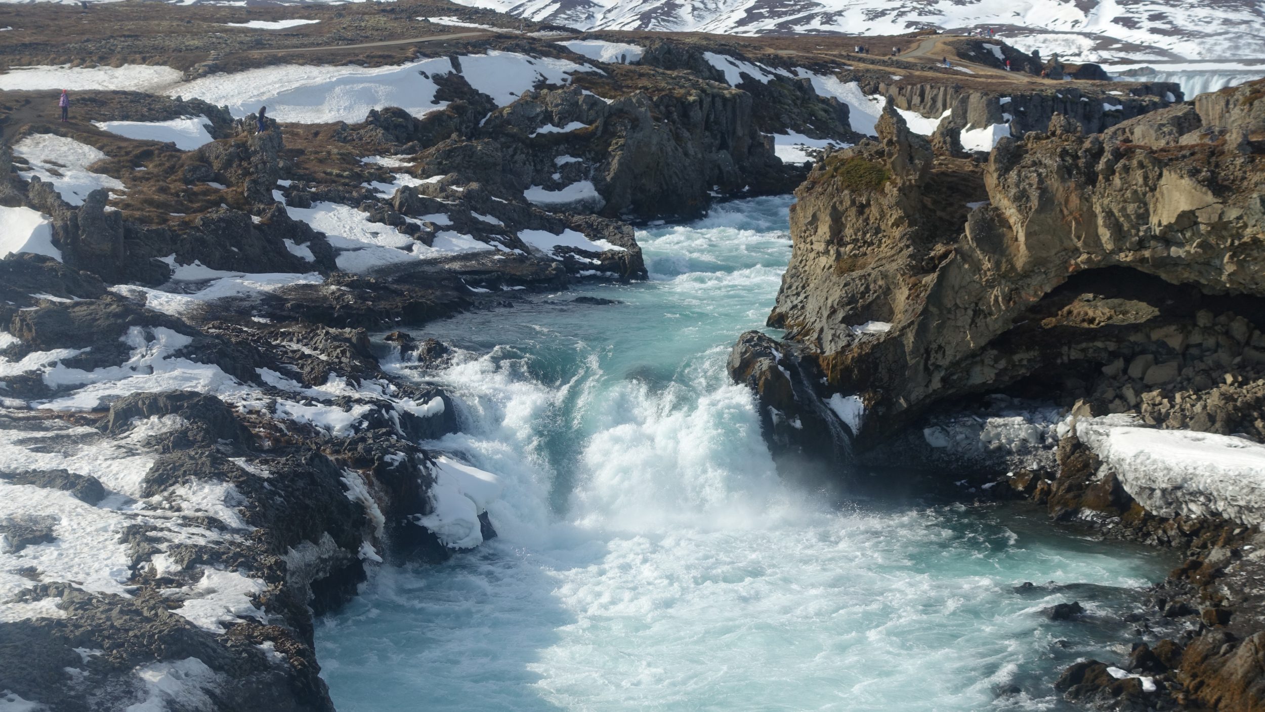 Zatrzymujemy się w pobliżu stacji benzynowej N1, aby zobaczyć wodospad Geitafoss. Jest mały, ale bardzo nam się podoba, bo za bardzo przypomina nam wodospad Huka w Nowej Zelandii. Bardzo silny przepływ, ten sam niebieski kolor, prawie ten sam most.