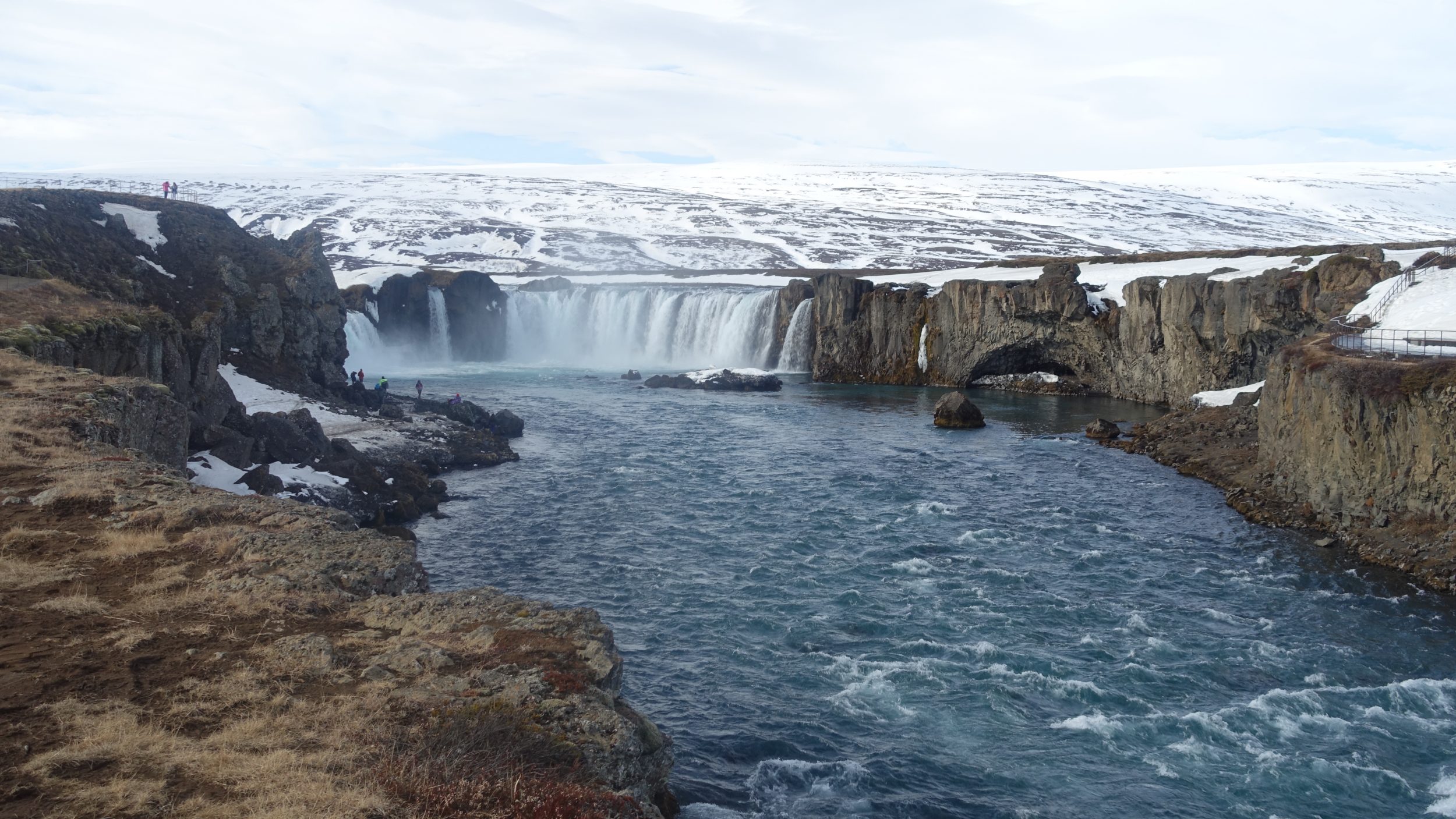 A potem idziemy pieszo wyznaczoną ścieżką, aby zobaczyć wodospad Godafoss. Cieszymy się, że zaparkowaliśmy po tej stronie, bo stąd lepiej go widać (jest też parking po drugiej stronie wodospadu).
