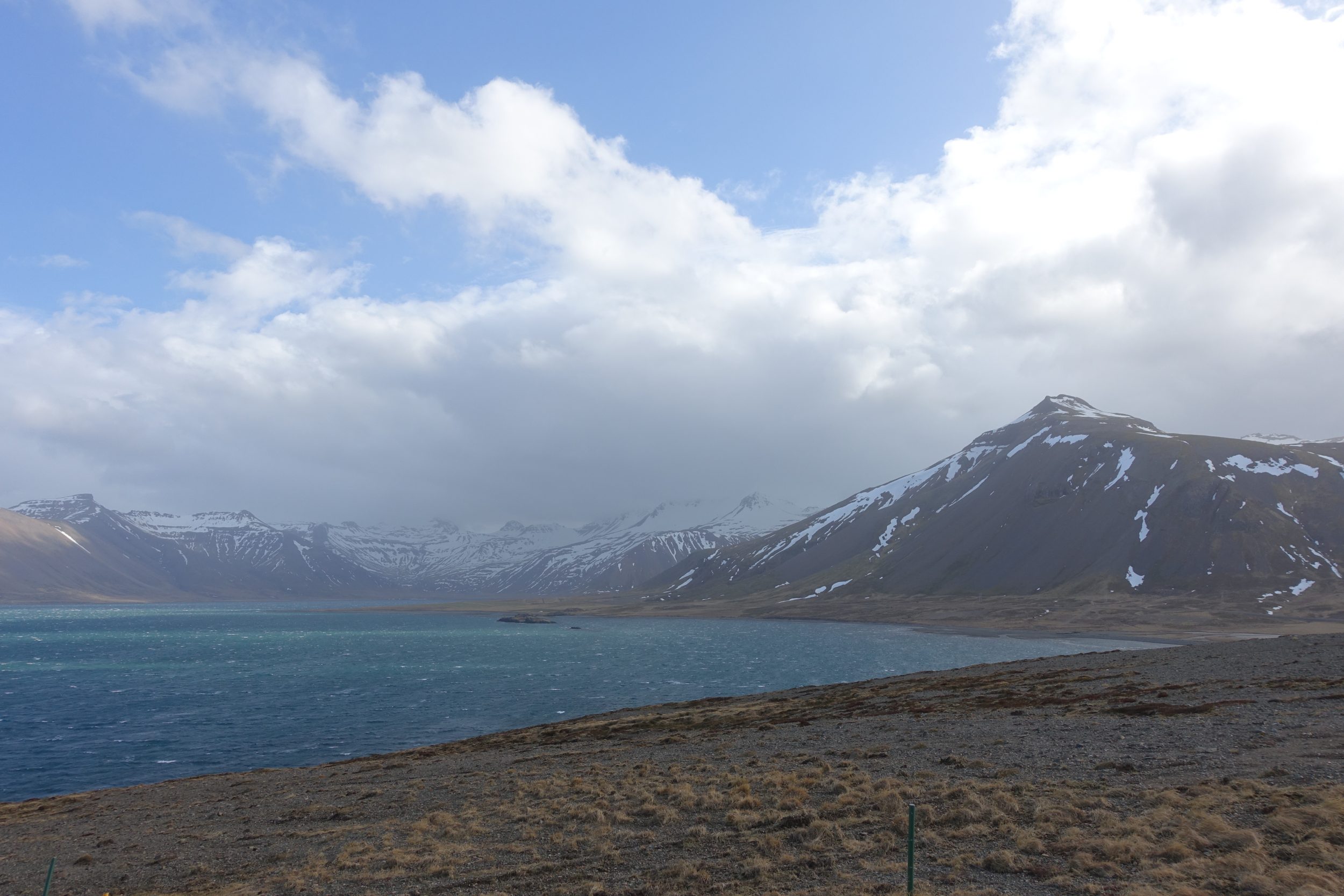 Wiatr nadal wieje bardzo mocno i podczas pokonywania tej małej drogi wcinającej się w środek fiordu, zostajemy całkowicie zraszani przez fale. Kiedy wysiadłem z samochodu, wiatr prawie wyrwał mi drzwi, a z powodu wiatru nie mogę już nawet chodzić prosto. 50 km/h ! Daj mi parasol, to odlecę.