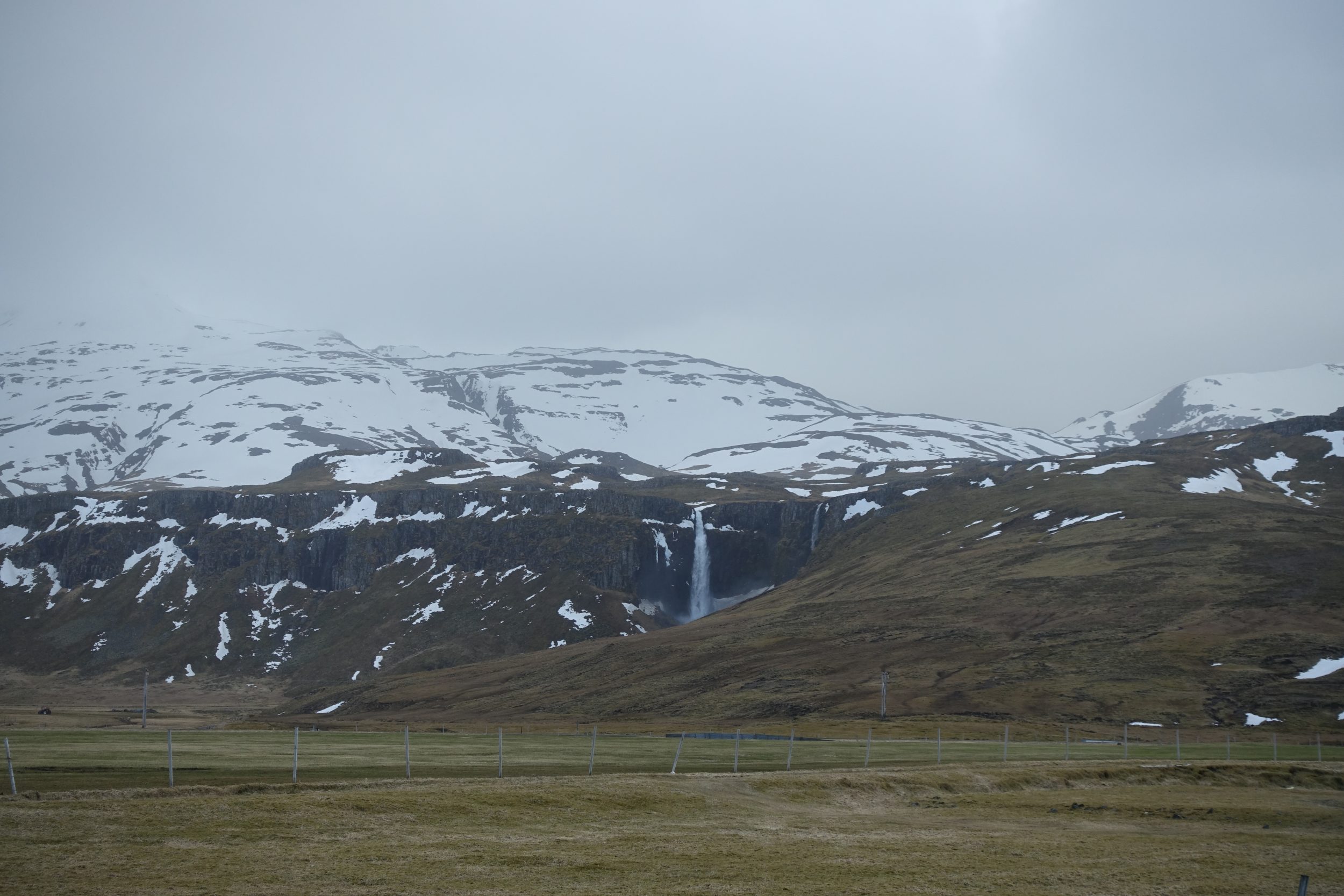 Tuż przed Kirkjufellsfoss widzimy ten ładny wodospad, którego nikt nie odwiedza, bo znajduje się na terenie prywatnym (i trzeba sporo chodzić, żeby do niego dojść). Ale jeśli macie czas, poszukajcie wodospadów wokół góry Kirkjufell, jest tam kilka bardzo pięknych.