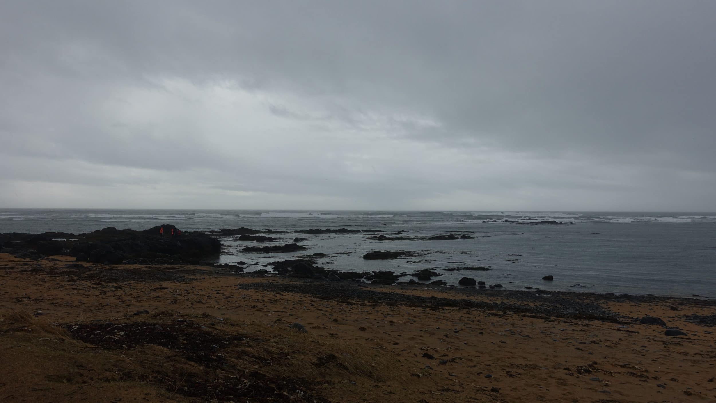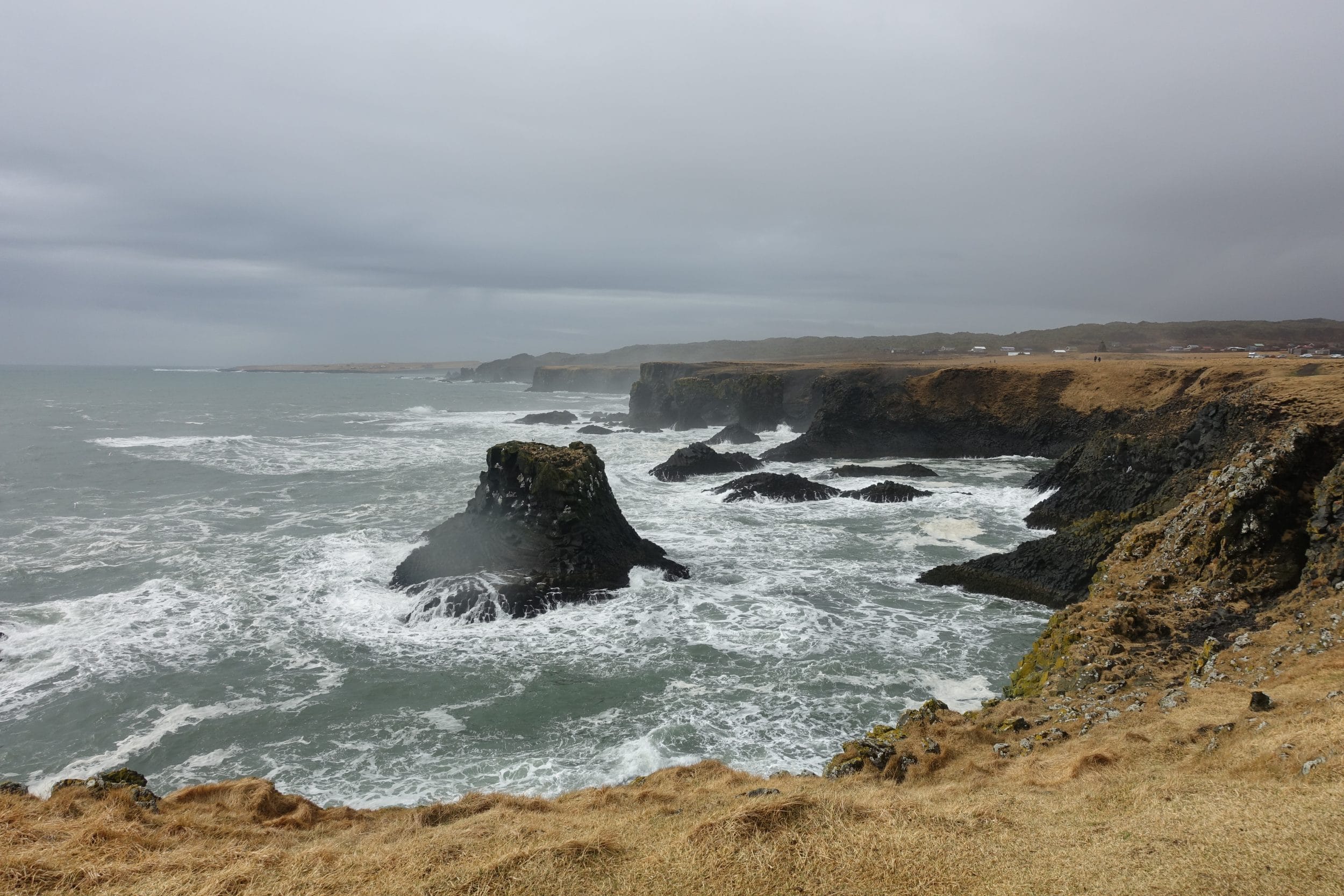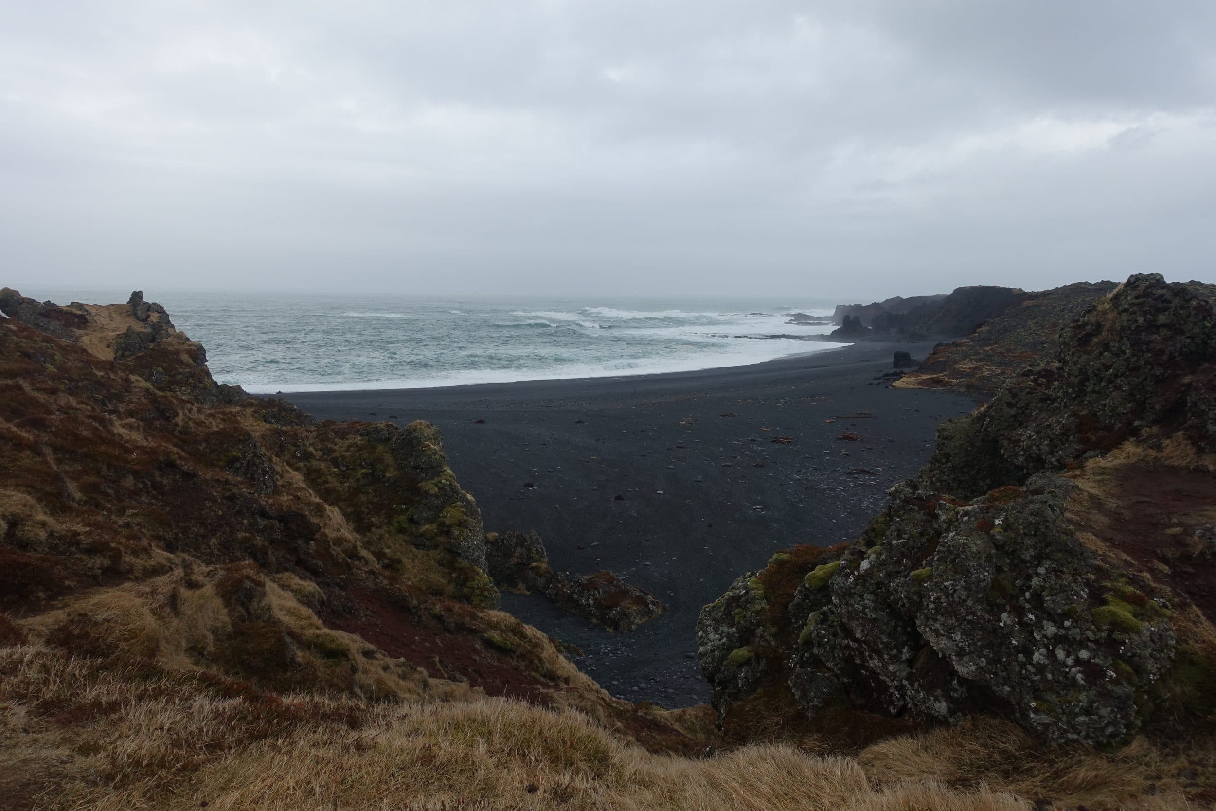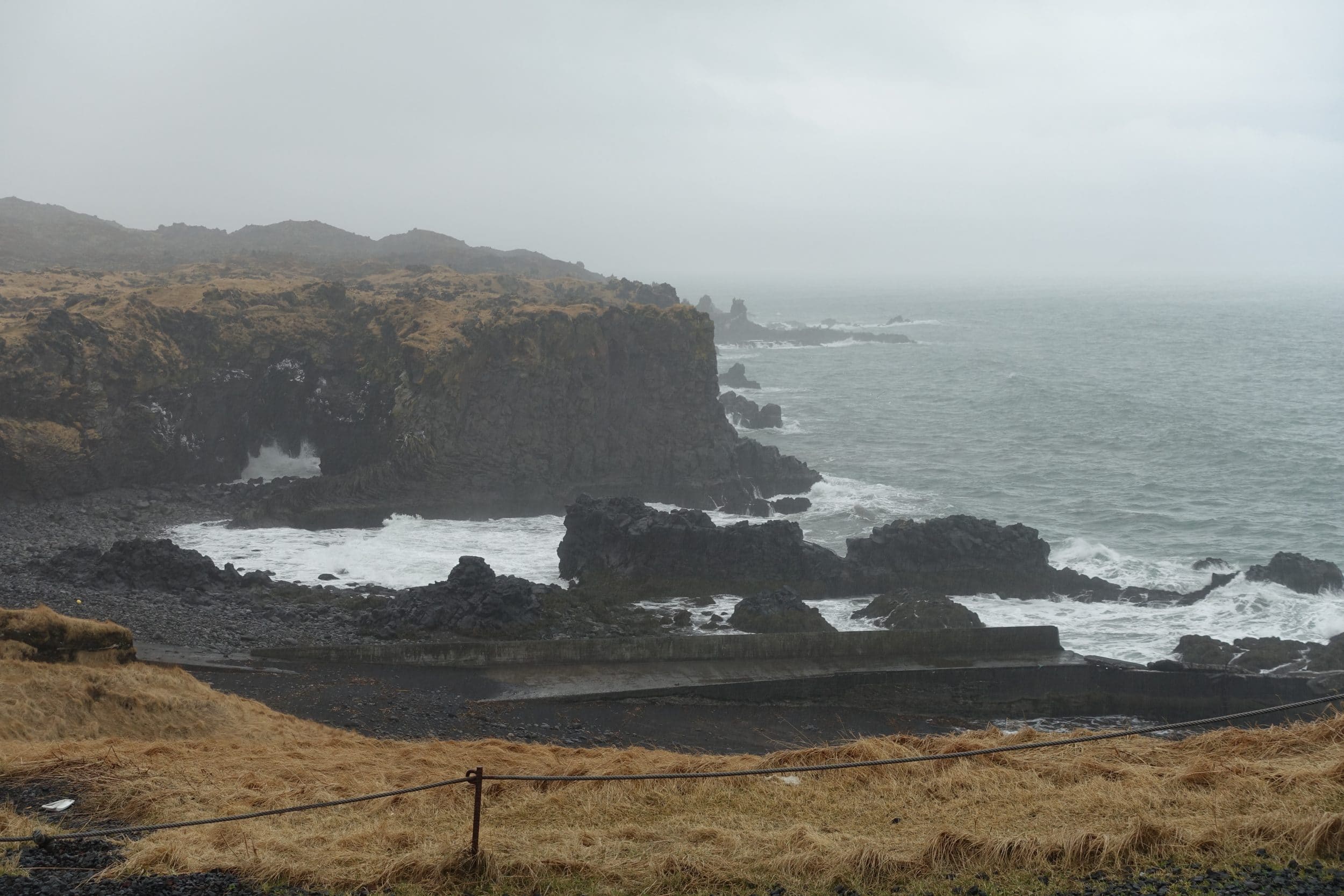 Krótki spacer prowadzi do tego punktu widokowego na plaży Djúpalónssandur. Jest jeszcze wiele innych punktów widokowych (między 1km a 2km), które można zwiedzać dalej i dalej, ale nie mamy na to ochoty, gdy tak pada.
