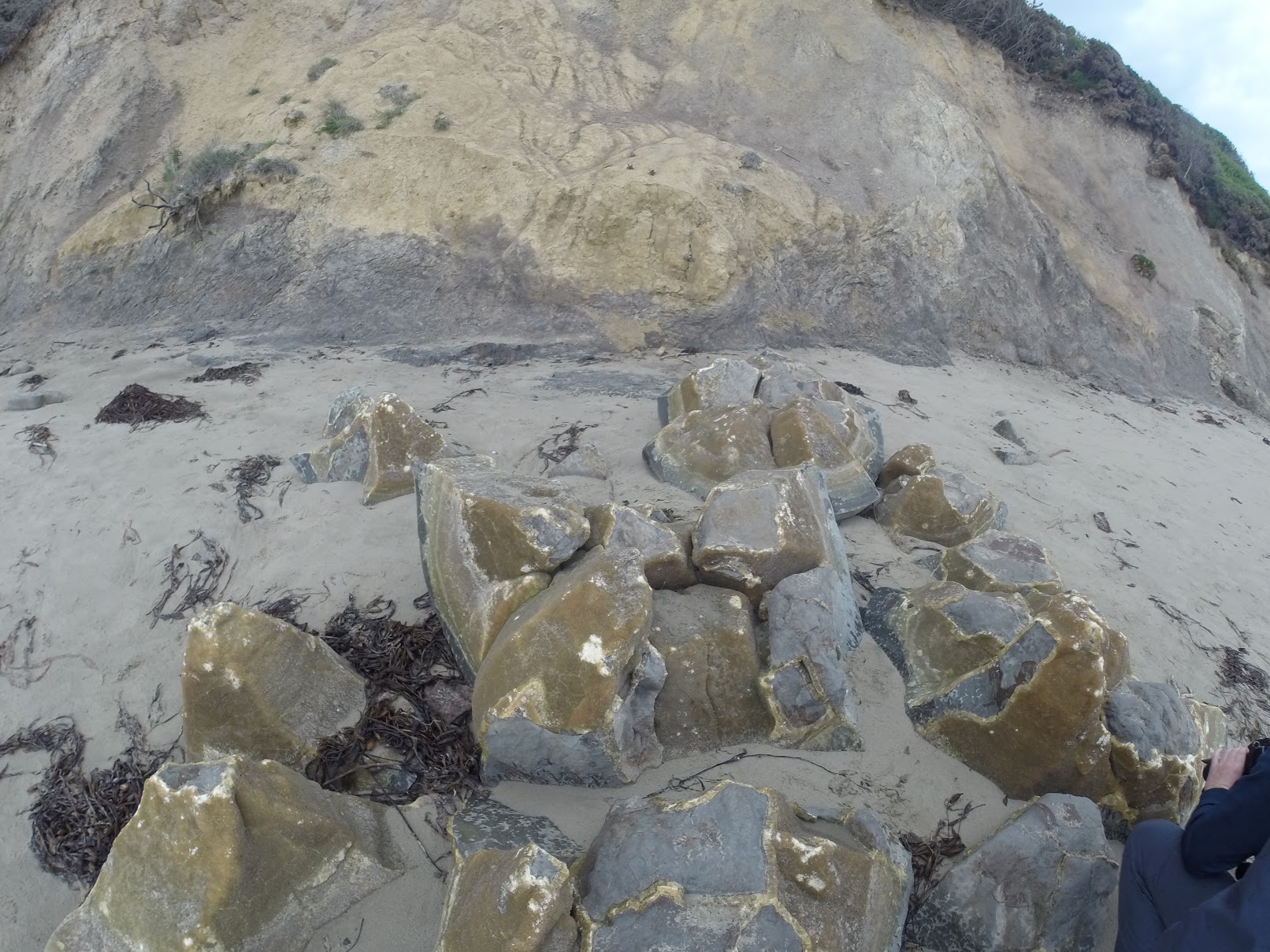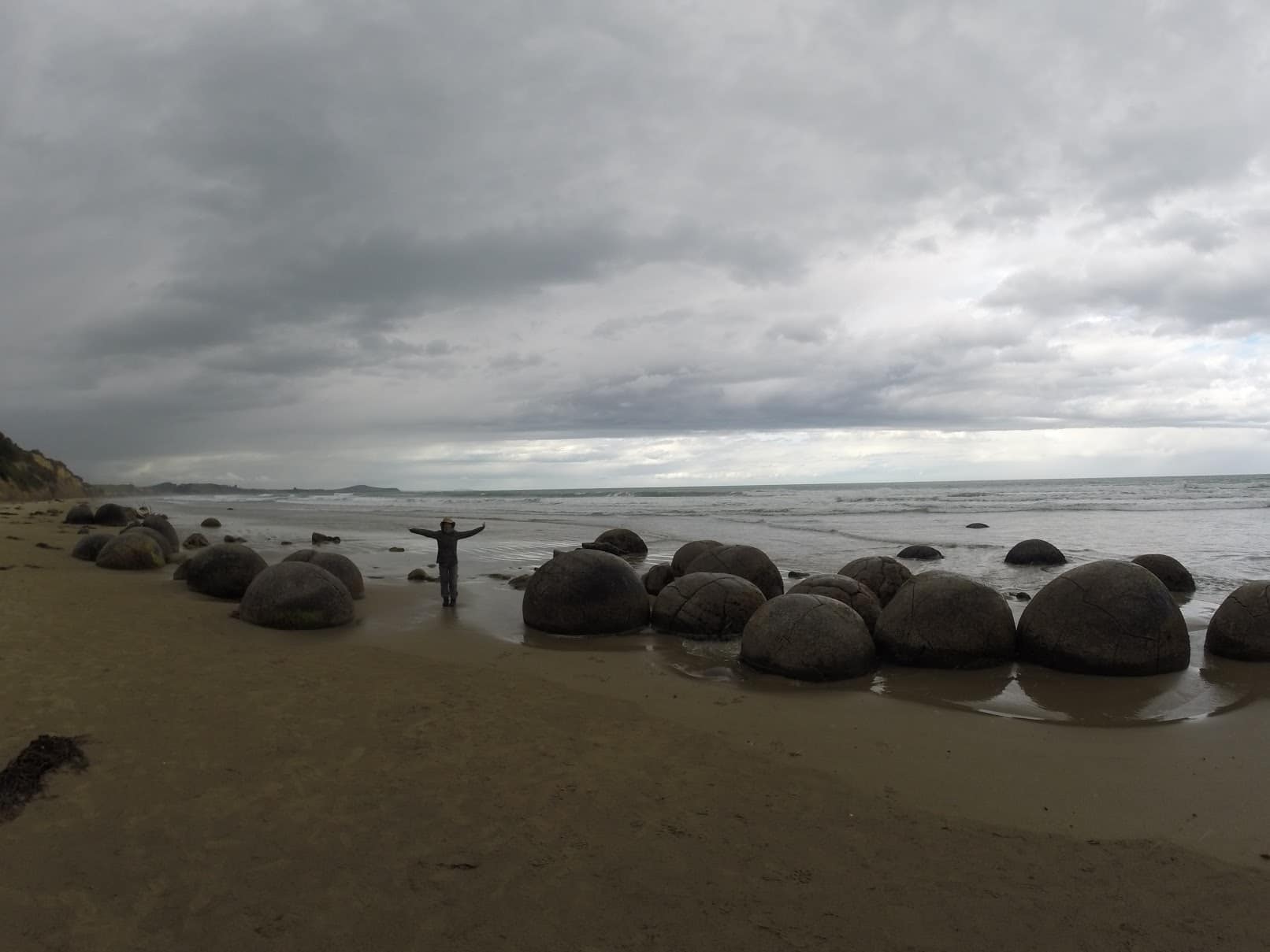 do Moeraki Boulders w deszczu i wietrze. Są to głazy z czasów dinozaurów. Czy są to skamieniałe jaja dinozaurów, czy tylko skamieniałe głazy? Nikt nie wie.