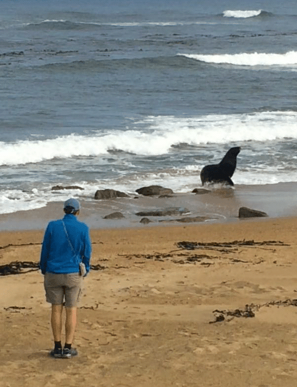 Nie będziemy tu czekać cały dzień. Po prostu jedziemy do Purpoise Bay, ogromnej białej piaszczystej plaży ciągnącej się przez kilka kilometrów, mając nadzieję, że zobaczymy jakieś delfiny Hectora. Mają zwyczaj podążania za surferami, którzy dezorientują ryby piaskowe (ich ulubiona zdobycz). Przy 3 surferach w wodzie i dużym wietrze mamy nadzieję zobaczyć jakieś delfiny, ale niestety nie ma ich tam. Nie ma szans! Ponieważ ktoś widział je zaledwie 2 dni temu. W lecie musi to być idealna plaża. Surfing z dzikimi delfinami, co za emocje!