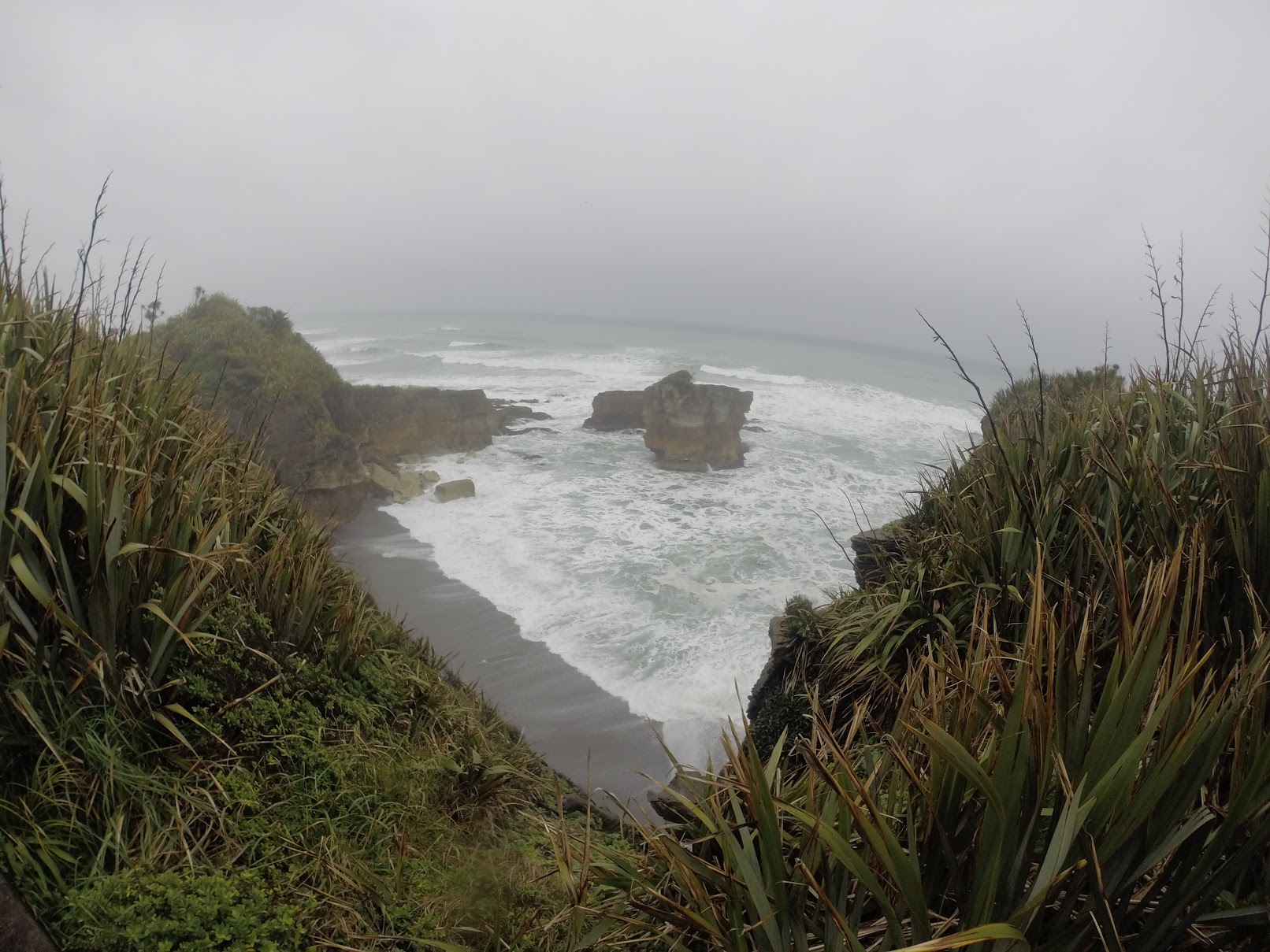 Zatrzymujemy się w Punakaiki, aby zobaczyć słynne „skały naleśnikowe”, obowiązkową atrakcję regionu. W czasie przypływu fale wdzierają się do jaskiń i wypływają przez otwory wentylacyjne. Jesteśmy tam, gdy zaczyna się przypływ, kilka nieśmiałych fal wraca przez wydmuchiwany otwór, jest to mniej imponujące niż na zdjęciach w przewodnikach, ale 30mn wizyta pozostaje przyjemna, mimo deszczu. Zwłaszcza, że turystów jest mniej niż zwykle