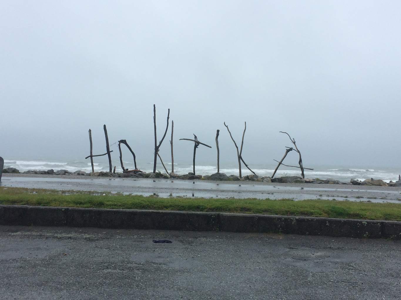 (1) Na plaży w Hokitika, znajduje się kilka zabawnych rzeźb z drewna, z których jedna tworzy nazwę miasta: Hokitika. Można się zastanawiać, jak to się dzieje, że mimo takiego wiatru i deszczu jak dziś, wciąż stoi