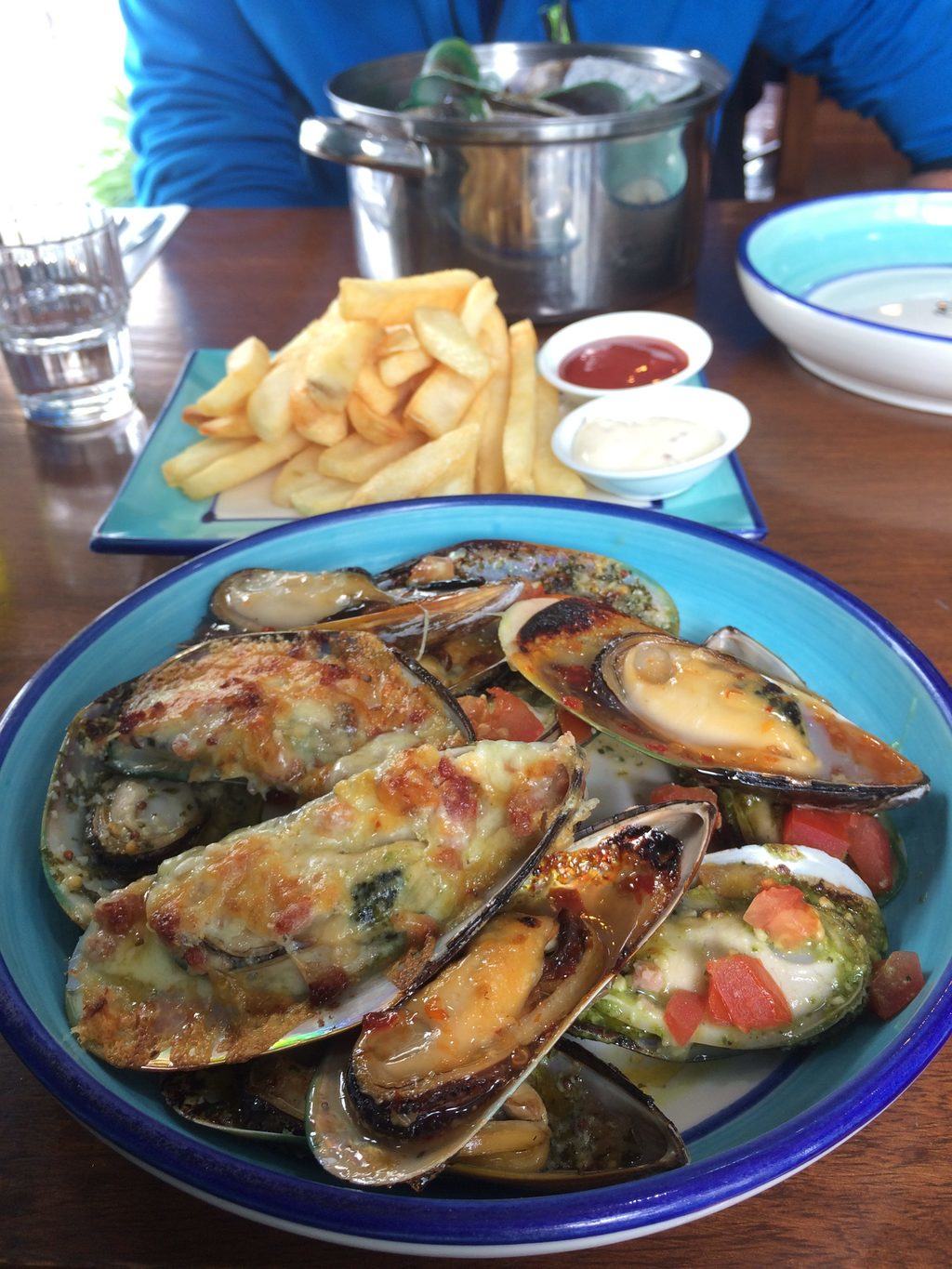 Gigantyczne zielone małże z Nowej Zelandii (mniam): menu bardzo dobrze wyjaśnia, jak hodowane są małże. Normalnie, 10m od restauracji znajduje się farma małży.