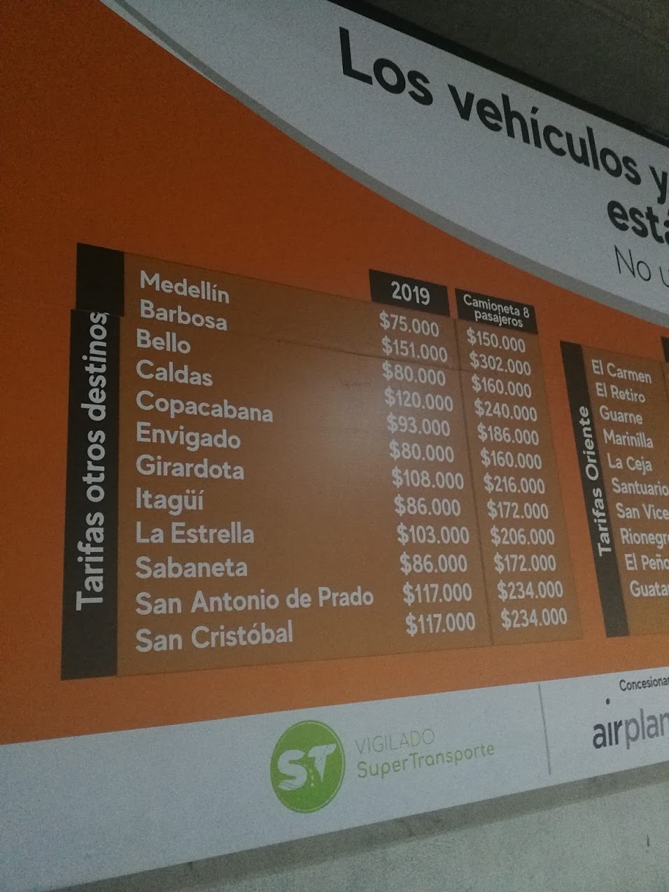 Jak tylko opuścisz lotnisko, od razu zobaczysz wyraźnie oznaczone ceny taksówek. Taryfa do Medellin, zarówno do centrum jak i do El Poblado (nasza dzielnica) wynosi 75000COP. Inne taryfy, które widać na znaku, dotyczą obszarów podmiejskich.