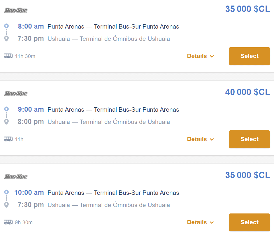 - Bus-Sur: Punta Arenas -> Ushuaia 3 razy w tygodniu (poniedziałek, wtorek i piątek). 8:15 – 20:00. Bilety można kupić online. 35 000$CH/osoba