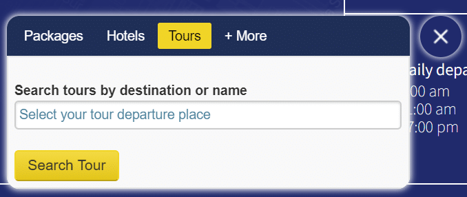 Nawet jeśli już wiesz, czego chcesz, każdy link „zarezerwuj teraz” lub „rezerwacja” powoduje wyświetlenie tego obrzydliwego wyskakującego okienka „TOURS”. Na początku zignorowałem to, myśląc, że to błąd. Kupuję bilety na prom, a nie na wycieczki! Ale tak, musisz „wyszukać wycieczki według celu lub nazwy”.