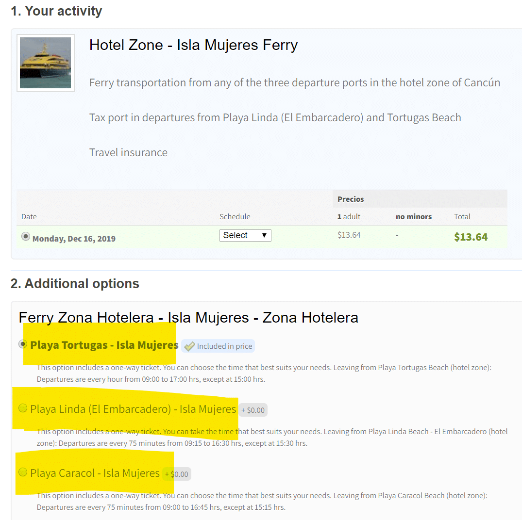 To tutaj możesz wybrać bardziej skomplikowane bilety (Express, Hopper itp.). Jeśli chcesz kupić prosty bilet na przejazd Playa del Carmen => Cozumel, powinieneś wybrać pierwszą opcję za 11 dolarów.