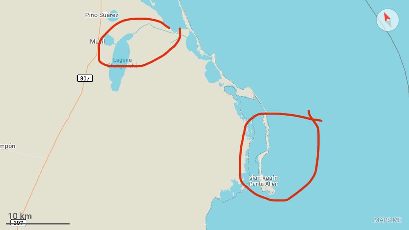 Kilku turystów mówiło, że łodzie znajdują się kilka KM od wejścia do rezerwatu (wejście do rezerwatu nazywa się Arco Maya, sprawdźcie na Google Maps) – nie trzeba więc jechać do Punta Allen. Informacje są trochę sprzeczne: jedne wycieczki są kilka KM od wejścia, o każdej porze – inne mówią o rybackich łodziach, które podrzucają turystów po całym dniu zwiedzania i wracają puste do Punta Allen i mogą Cię tam zawieźć za grosze. Niestety nie udało mi się zweryfikować tej informacji na miejscu.