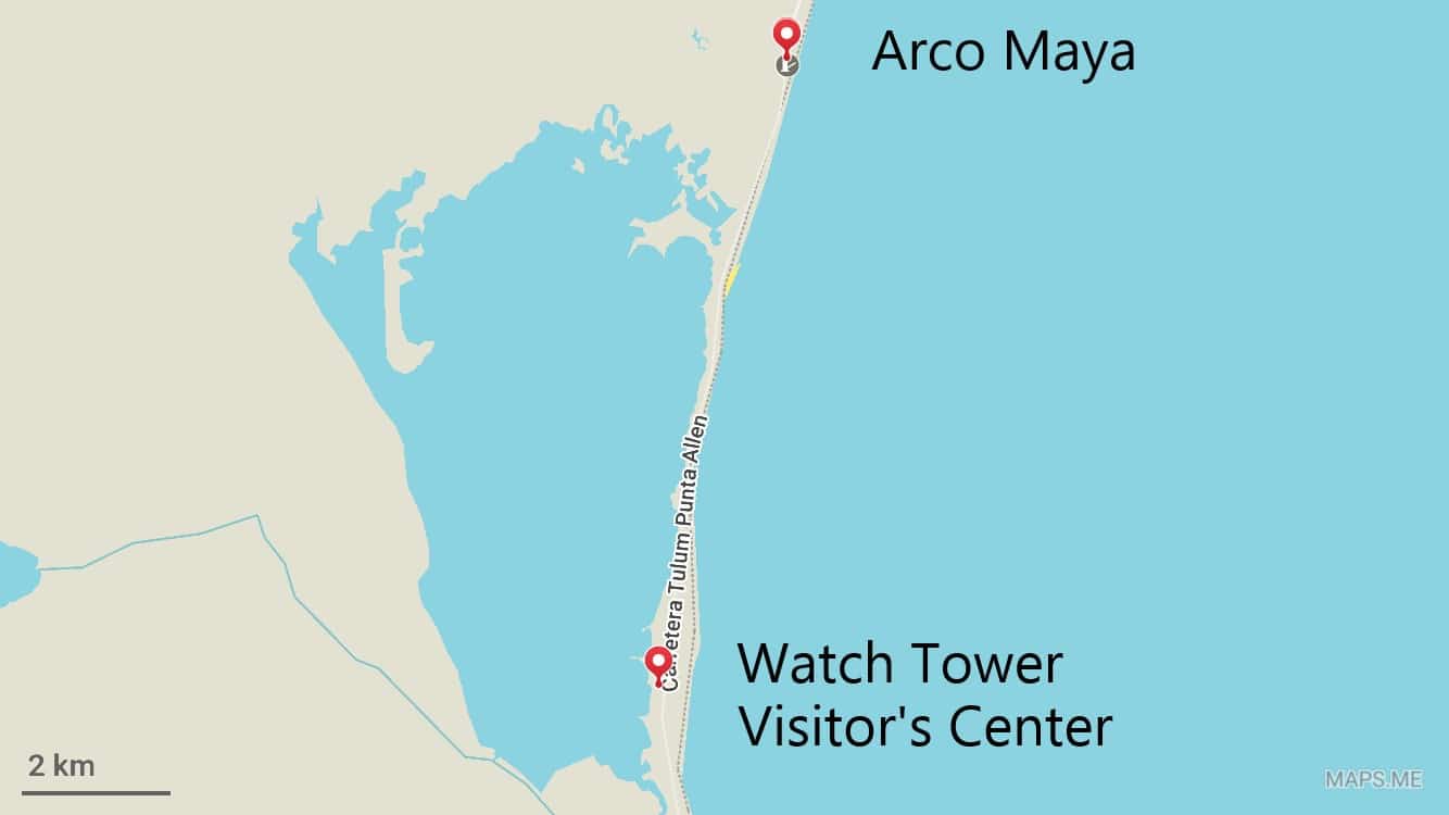 W każdym razie są 3 różne źródła, które mówią o łodziach przy Watch Tower – Visitor’s Center za 700MXN (można znaleźć na Maps.me, wpisać Watch Tower Visitor’s Center Sian Ka’an lub wyszukać na mapie Maps.me), 8,8km od Arco Maya (wejście do rezerwatu).
