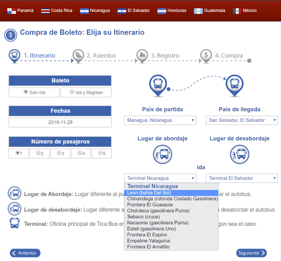 Na autobus Tica, można kupić bilety online (Visa lub Mastercard). Aby wyruszyć z Leon, nadal musisz wybrać „Managua” jako miejsce wylotu, a następnie w polu „Nicaragua terminal” wybrać Leon. Ale naprawdę radzę pojechać przez agencję – ten autobus często się spóźnia, lepiej mieć kogoś wiarygodnego, do kogo można się zwrócić z pytaniami lub taksówkę, która odbierze nas o właściwej porze – zamiast czekać 1h30 na stacji benzynowej.