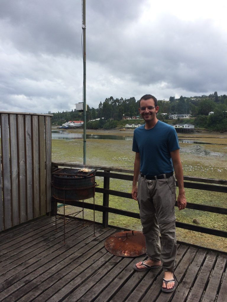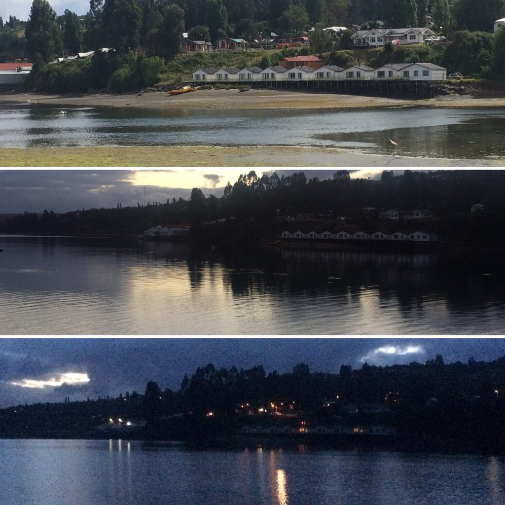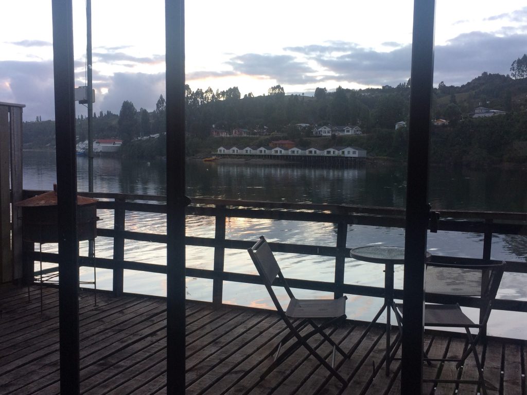 Widok z naszego pokoju jest z czasem coraz lepszy. Wygląda na to, że można, nawet jeśli jest to bardzo rzadkie, zobaczyć delfiny w zatoce. Czy widzisz domy naprzeciwko na palach? To typowe dla wyspy Chiloé! Nasze mieszkanie jest również na palach!