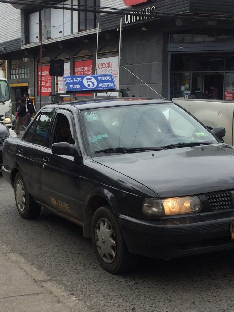 Terminal Castro jest bardzo ruchliwy. Przy wyjściu na zewnątrz czeka kilka taksówek collectivo (jest to wspólna taksówka z wcześniej ustaloną trasą por. zdjęcie poniżej), ale żadna z nich nie jedzie do naszego hotelu (który znajduje się nieco dalej, w Nercon)