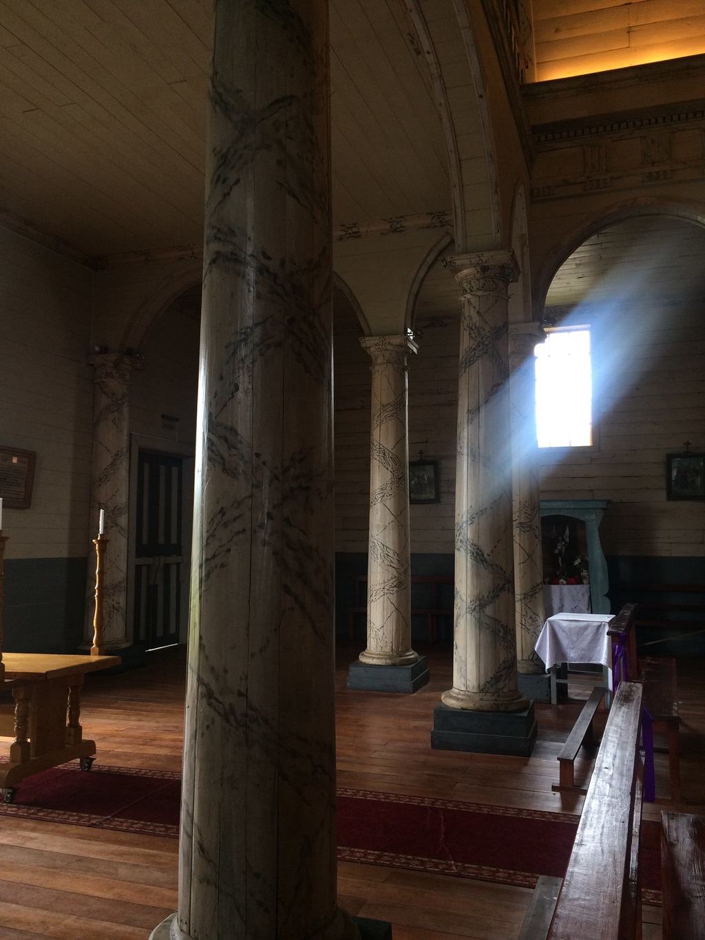 Wracamy autobusem do hotelu, zatrzymując się przy drewnianym kościółku Nercon (również sklasyfikowanym przez Unesco). Nie ma szczęścia, zaraz potem odbędzie się pogrzeb, mamy tylko kilka minut na obejrzenie wnętrza kościoła i jego kolumn pomalowanych na wzór marmuru