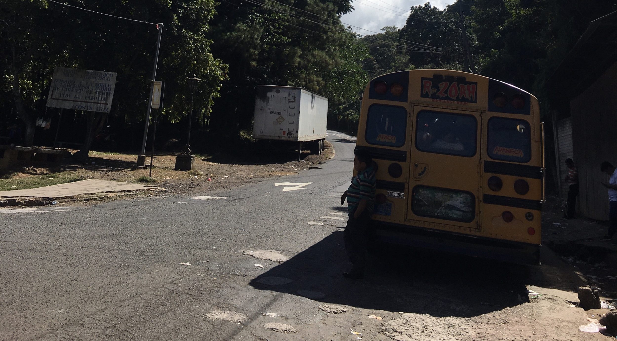 - Z tego samego terminalu wsiądź do autobusu, który wygląda jak amerykański autobus szkolny. Ruta 249 (w kierunku Ahuachapan). Uważaj, Ataco nie jest przystankiem końcowym, musisz poprosić o przystanek po drodze (zawsze jest kilku wysiadających). Przystanek w Ataco znajduje się tuż przy wjeździe do miejscowości(Google Maps)
