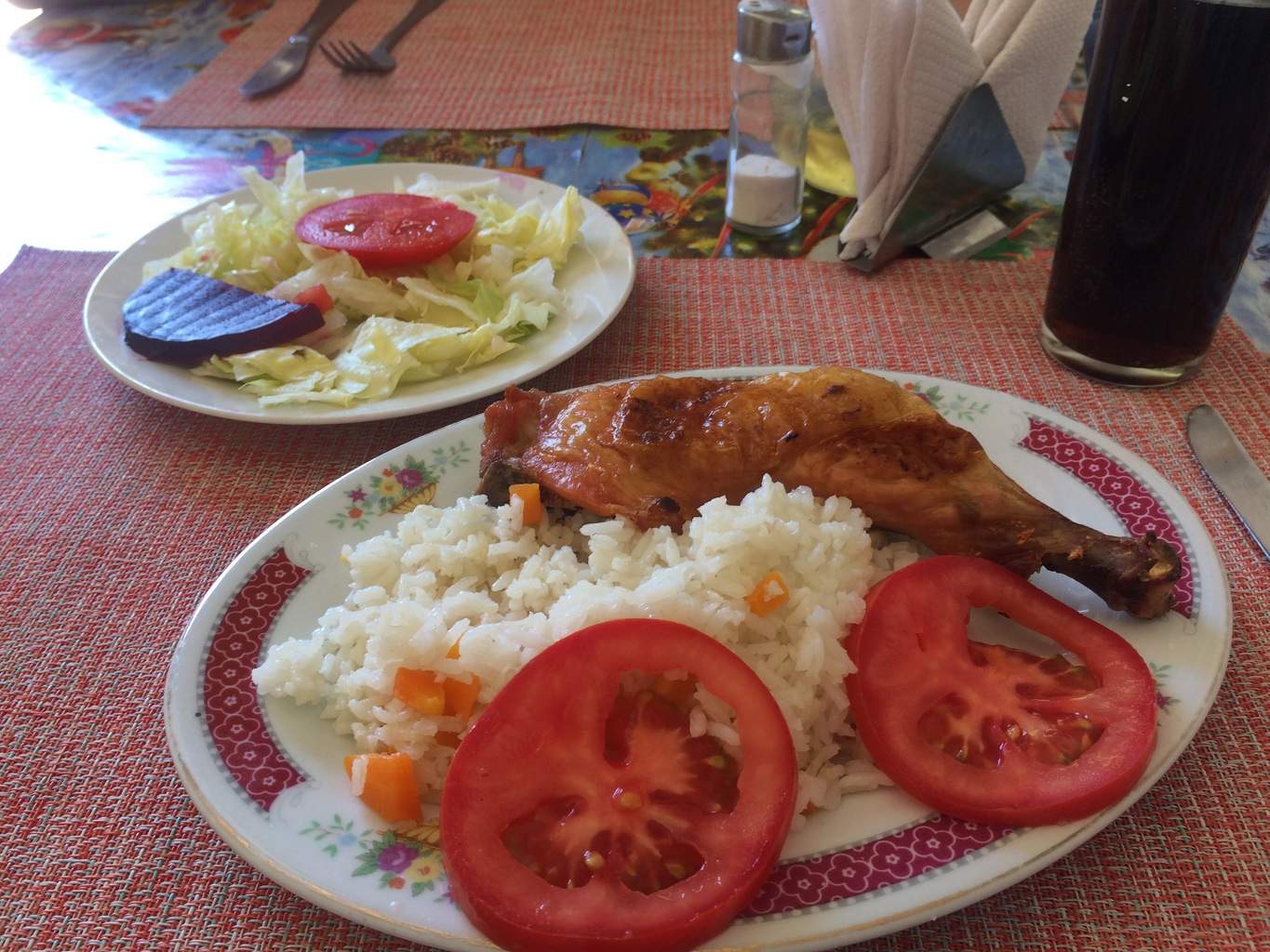 W obliczu tak wielkiego bogactwa i obfitości, postanawiamy zaoszczędzić nasze pieniądze w lokalnej restauracji, gdzie obiad kosztuje tylko 4400$CH za dwoje (6€), a nie 4000$CH za danie. Podczas gdy my patrzymy na menu, wszyscy zajęci są pokazywaniem nam dań lol: To jest pollo asado, to jest ensalada, pollo frito to jest to ahahahah To jest bezpretensjonalne, to jest dobre, to jest lokalne