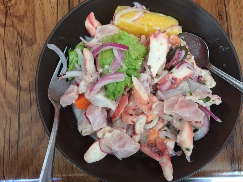 Mój żołądek woła o ceviche. Jest to okazja do spróbowania peruwiańskiego ceviche mixto, które bardzo lubię! Peru jest obiecujące! JB zadowoli się tylko owocami, w ramach przygotowań do wielkiego grilla, który czeka nas tego wieczoru w schronisku
