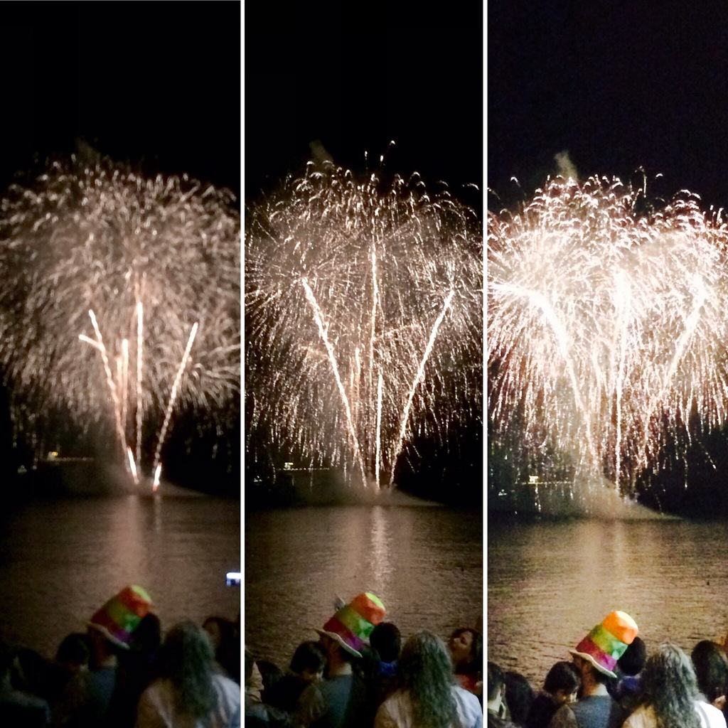 Pięć minut po północy, wszystkie fajerwerki są wystrzeliwane synchronicznie z 9 platform zainstalowanych wzdłuż zatoki. Nigdy wcześniej tego nie widziałem! Nie wiemy, gdzie się zwrócić. To potrwa 20 minut, a końcowy bukiet jest wspaniały!