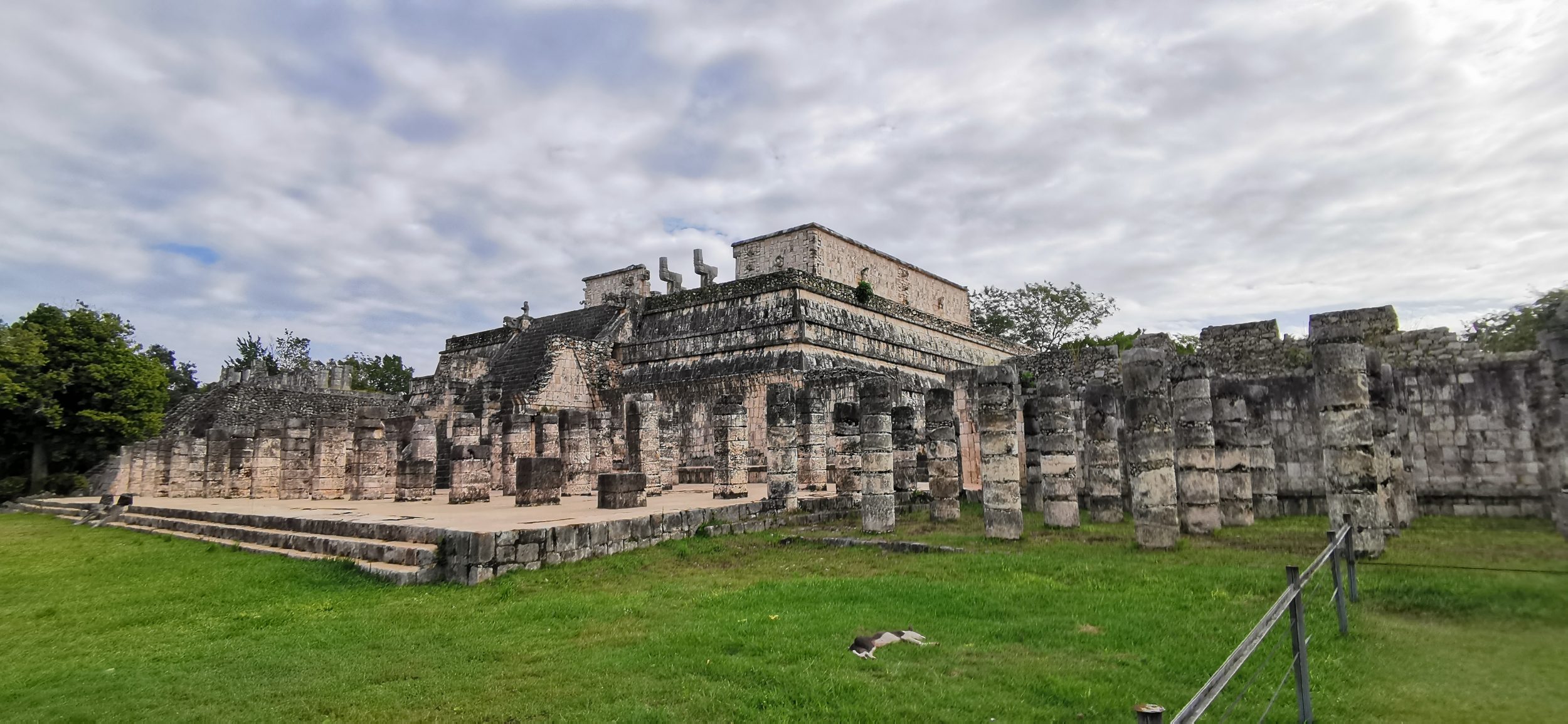 Następnie obserwujemy Świątynię Wojowników (niedostępną dla zwiedzających). Na szczycie, jeśli dobrze powiększysz, zobaczysz Chac Mool, posąg półleżącego człowieka, którego funkcją było przyjmowanie ofiar z ludzi (serce ofiarowanych ofiar). Obok niego znajdują się tysiące kolumn, niegdyś rzeźbionych, z których każda przedstawia wojownika, ale niewiele już widać.