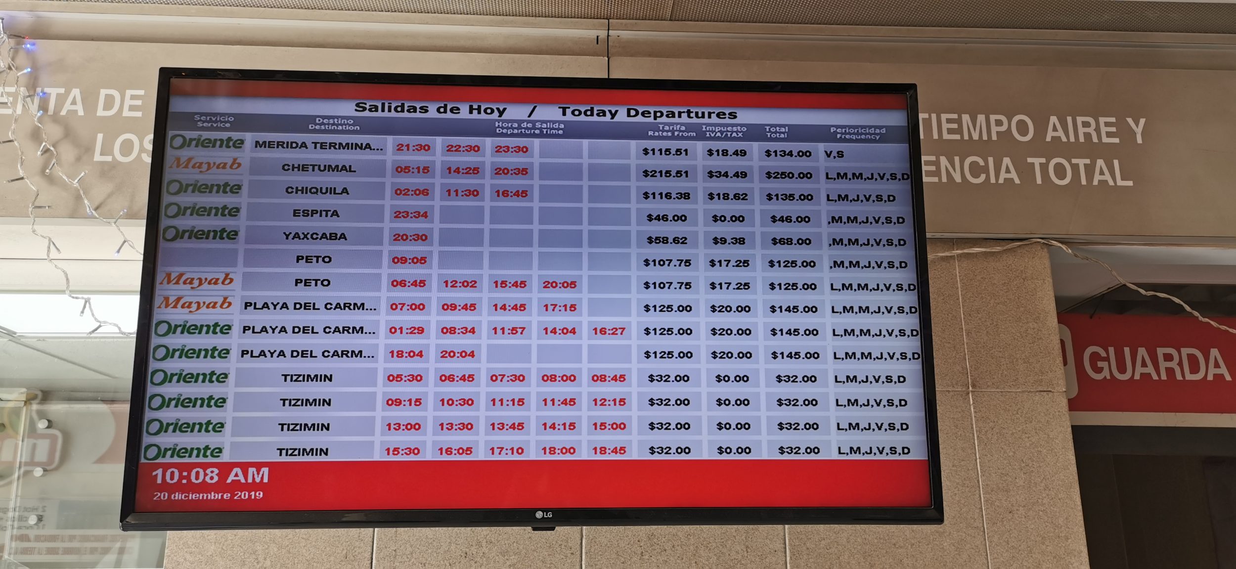 Rozkłady jazdy autobusów „drugiej klasy” z Valladolid, które odjeżdżają również z terminalu ADO w Valladolid. Uważaj, te rozkłady mogą się zmieniać (rozkłady w dni powszednie vs. weekendowe), lepiej wcześniej poprosić o potwierdzenie. Ostatnie 2 zdjęcia (na czerwono) zostały zrobione na terminalu autobusowym w Valladolid, są one bardziej wiarygodne niż dokument sporządzony przez hotel. Kliknij prawym przyciskiem myszy, aby je zapisać i powiększyć.