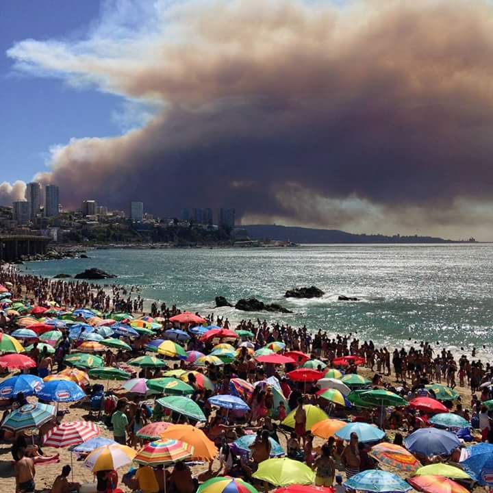 Z plaży w Viña del Mar widać pożar w Valparaíso (zdjęcie znalezione na Twitterze)