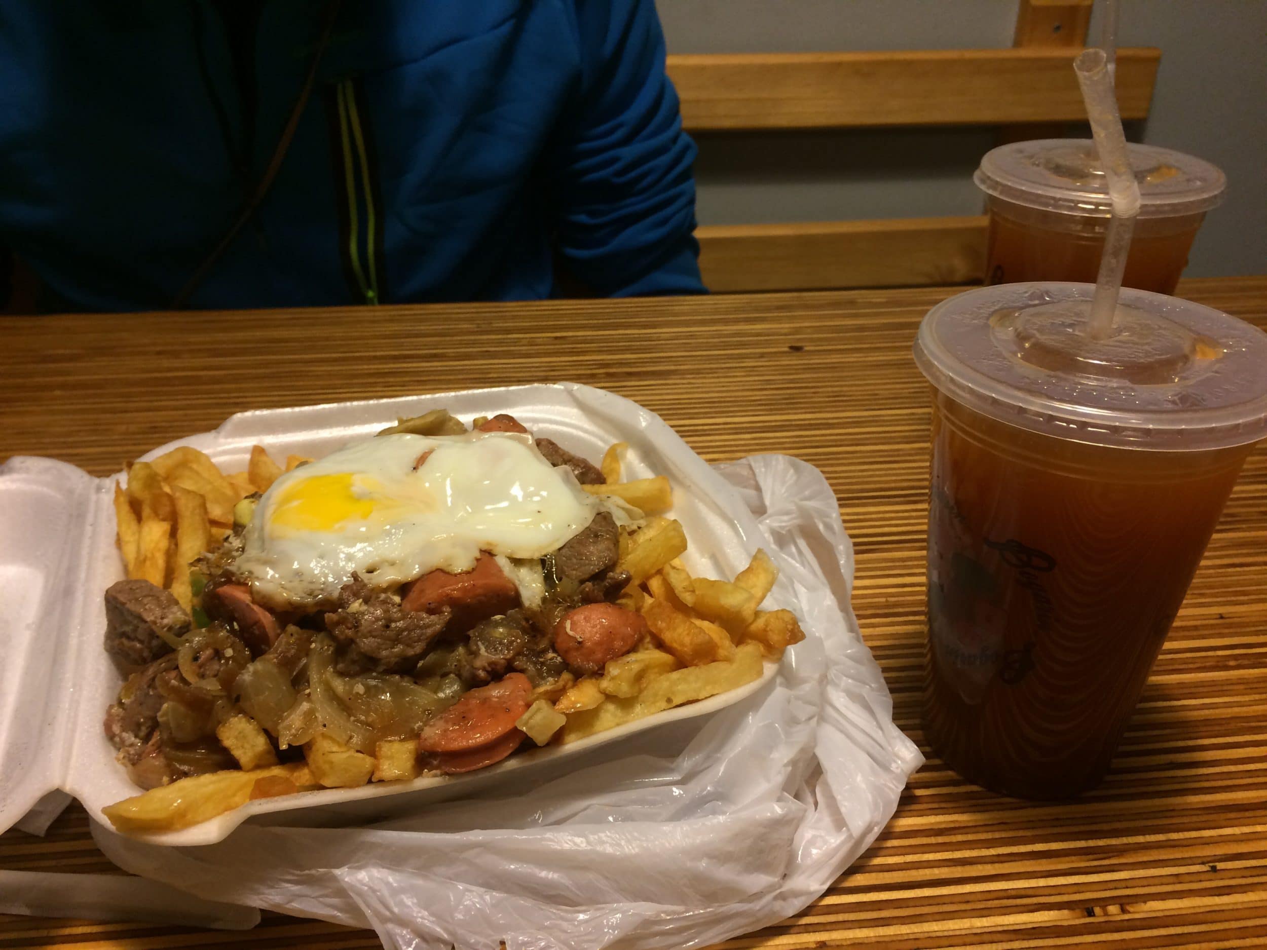 Za radą Jonathana próbujemy typowego chilijskiego dania, stworzonego tu, w Valparaiso: chorrillana, na poobiednią popijawę. JB ma dobry pomysł, aby wziąć indywidualną porcję dla dwóch osób…. zjemy tylko połowę