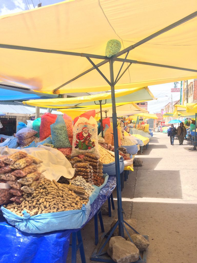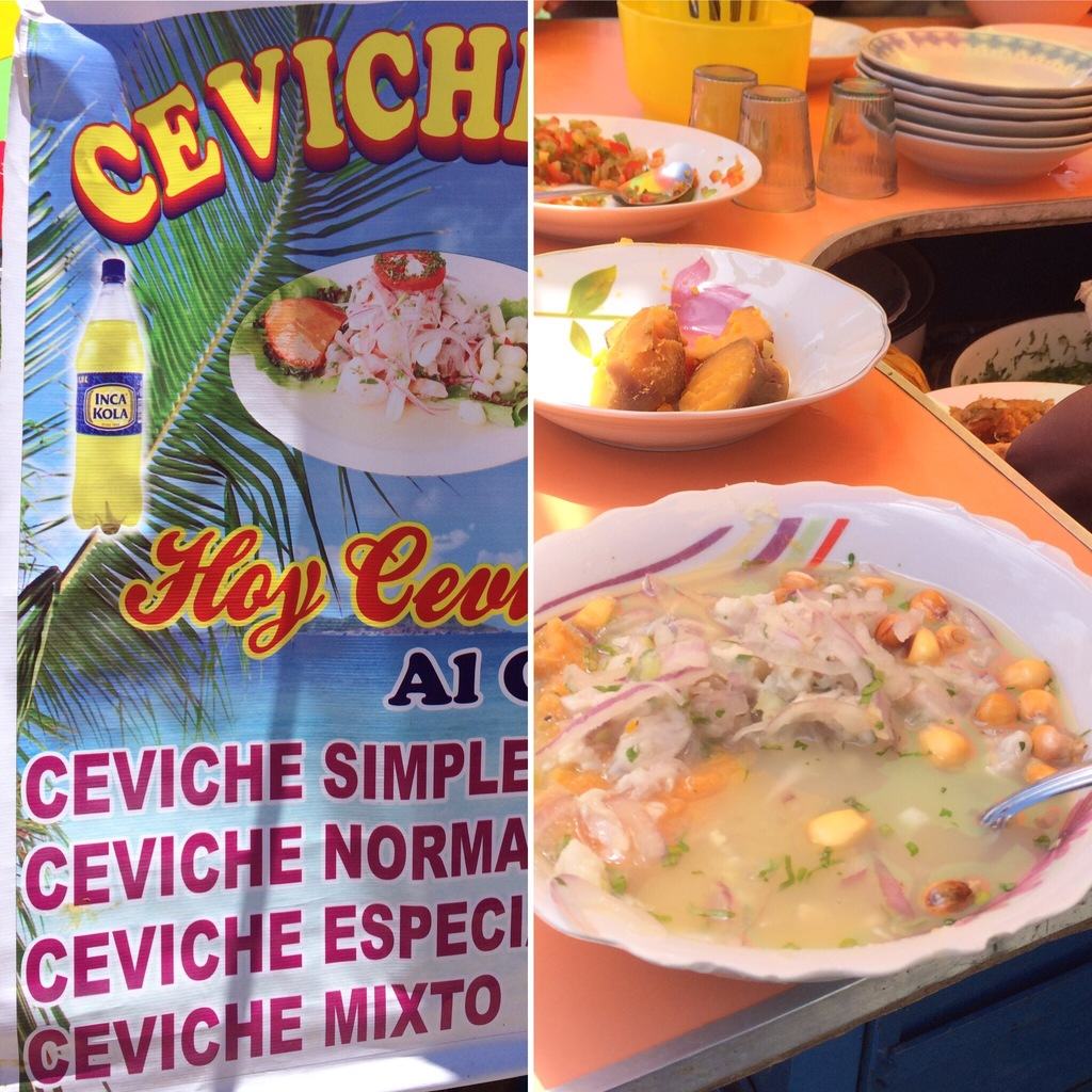 W południe, w pobliżu „terminalu autobusowego” (ulica, na której jest mnóstwo autobusów), jest mnóstwo stoisk, z których jedno sprzedaje najlepsze ceviche w mieście za 20$B. Boliwijskie ceviche (surowa ryba marynowana w cytrynie) różni się od tego, które próbowaliśmy w Chile, i znacznie bardziej przypomina wersję peruwiańską. Ma ekstra słodkie ziemniaki i lekki posmak imbiru (może mi się przyśnił), który lubię. Nie jest kwaśne jak w Chile. Wreszcie, jest super świeża, ponieważ ryba (pstrąg lub ryba królewska) pochodzi bezpośrednio z jeziora Titicaca