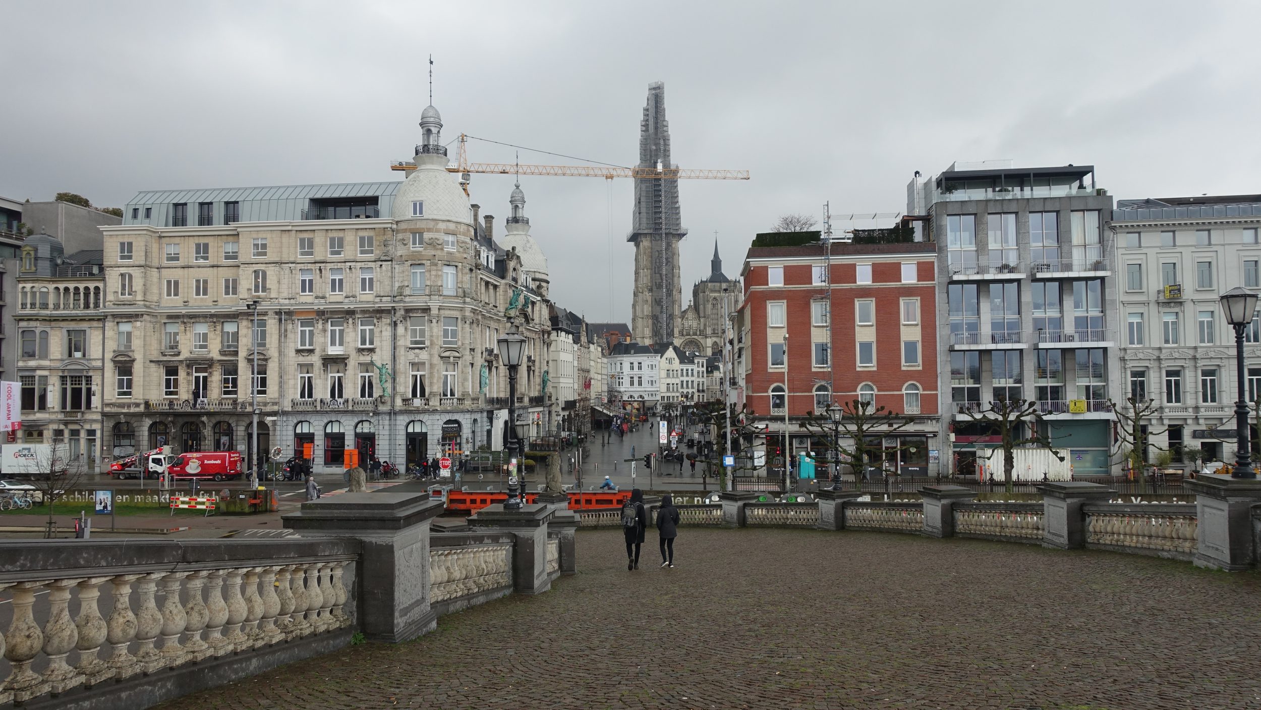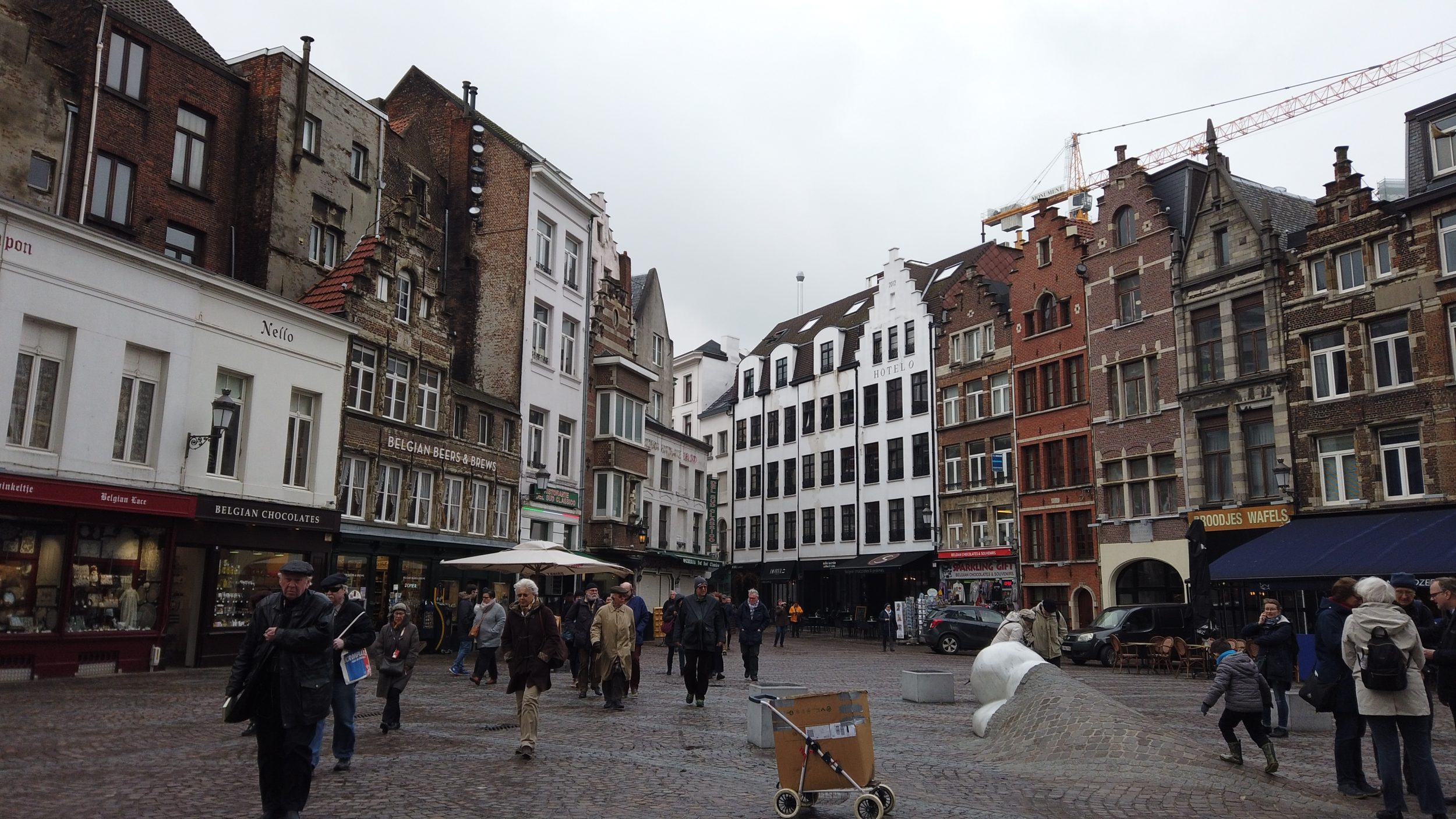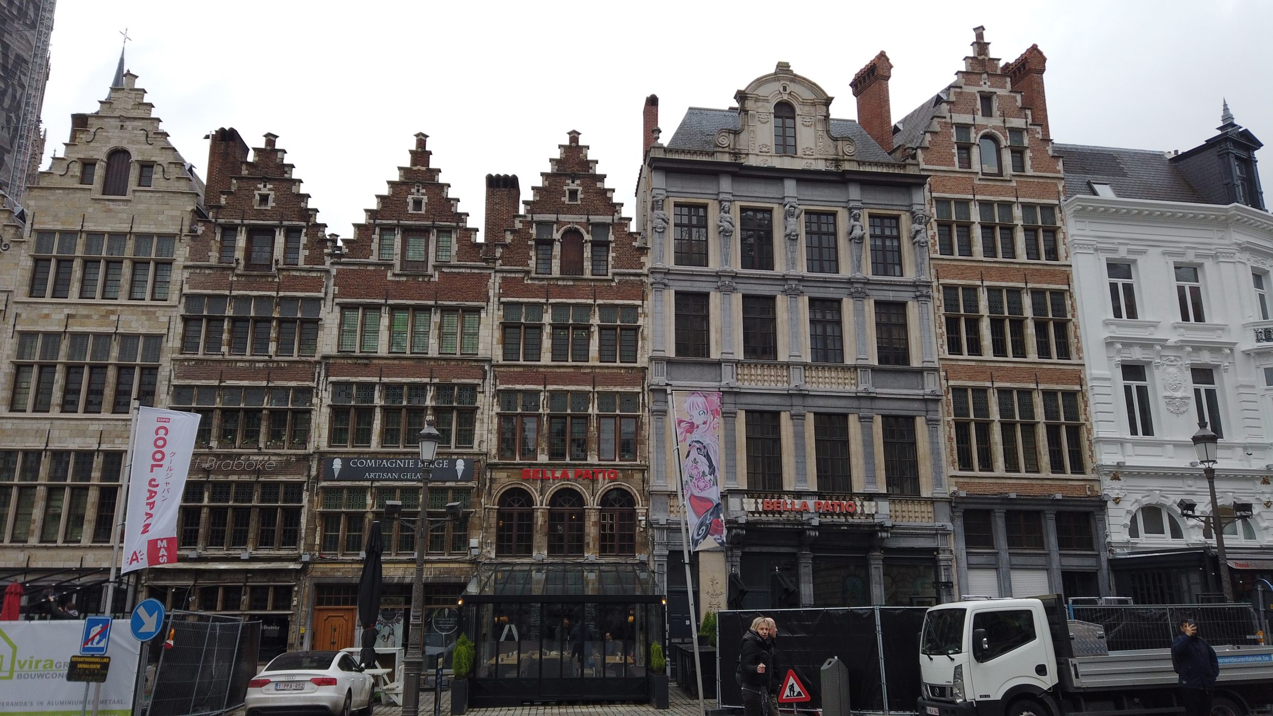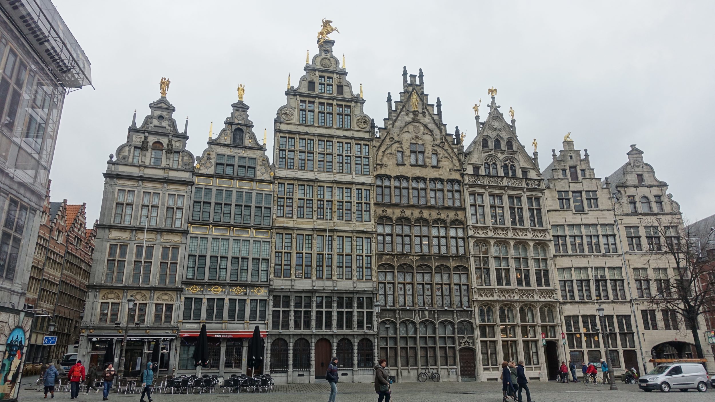 Ratusz, który bez prac musi być piękny, jest niestety zasłonięty przez ochronne plandeki. To miejsce jest bardzo piękne, mniej niż w Brukseli, ale mam wrażenie, że będzie przyjemniej niż w Brukseli, bo jest tam dużo restauracji z tarasami i mniej ludzi.