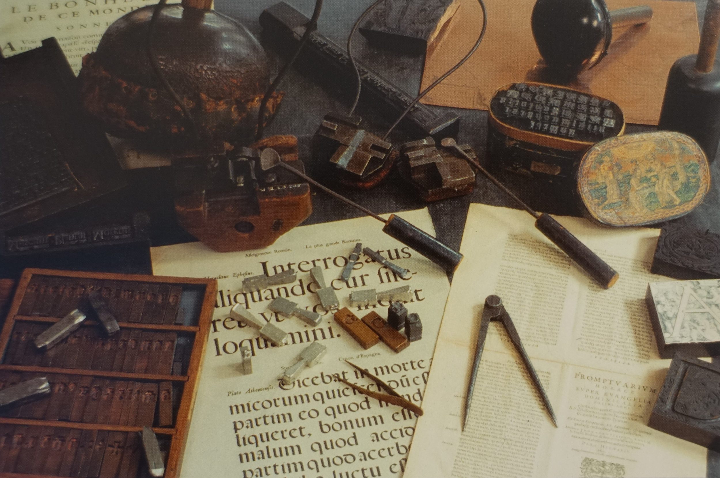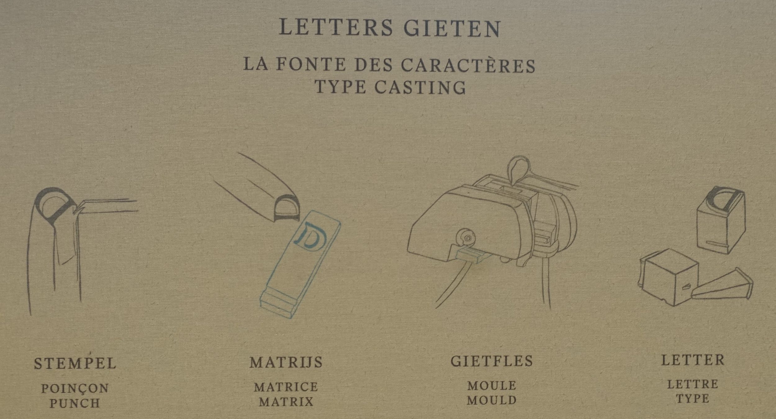Za pomocą plakatów i notatek dowiadujemy się, jak powstają litery. Najpierw grawer wykonuje stemple. To oni tworzą „czcionkę”. Mogą zatrzymać swoje ciosy lub nie. Ogólnie rzecz biorąc, rodzina Plantin-Moretus kupuje stemple, ponieważ tylko oni mogą używać czcionki stworzonej przez grawerów. W przeciwnym razie grawerzy sprzedają kilku drukarniom to, co nazywa się „matrycą”. Matryca pozwala, za pomocą specjalnej formy, na wykonywanie liter z ołowiu w nieograniczonych seriach.
