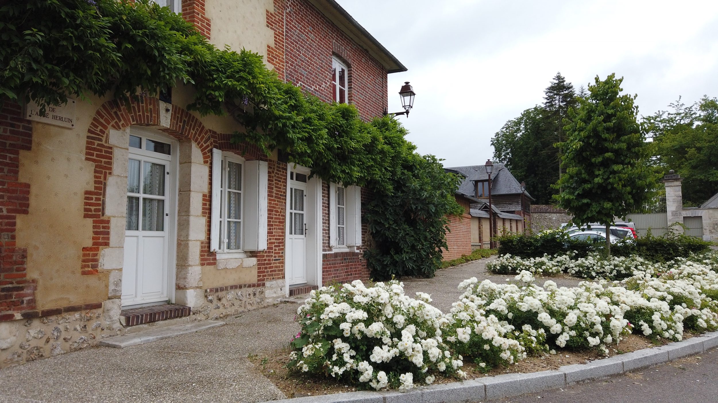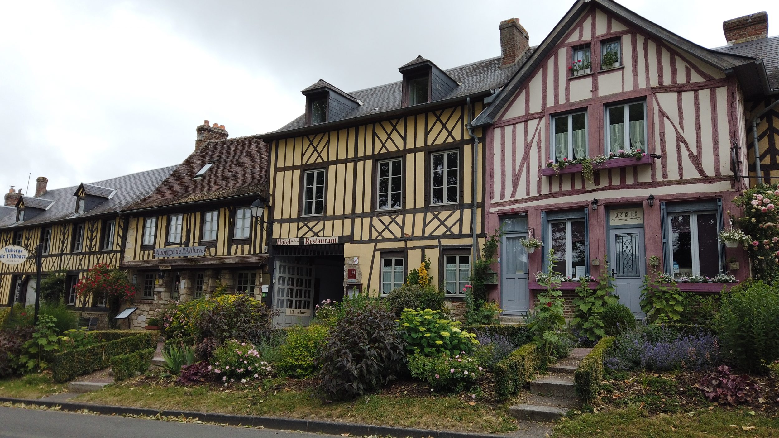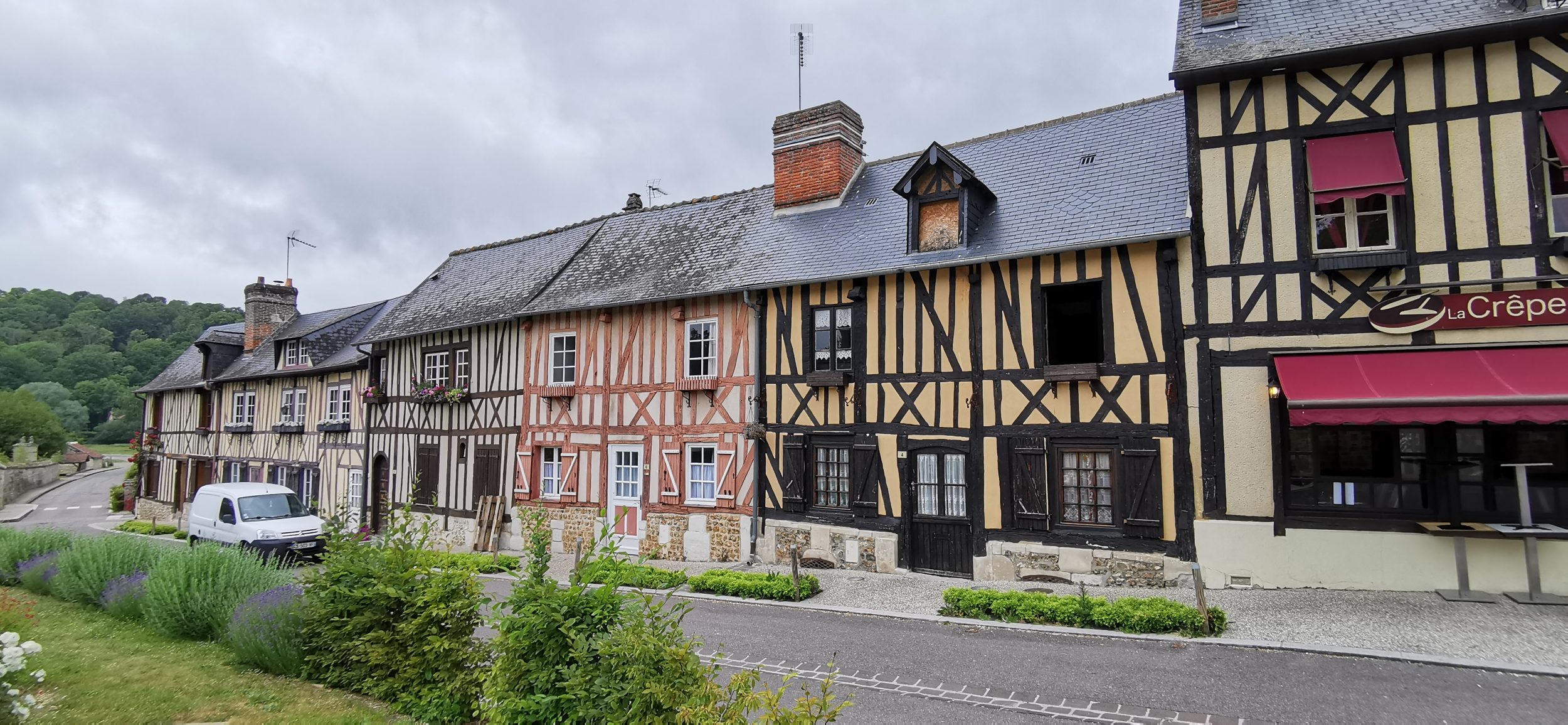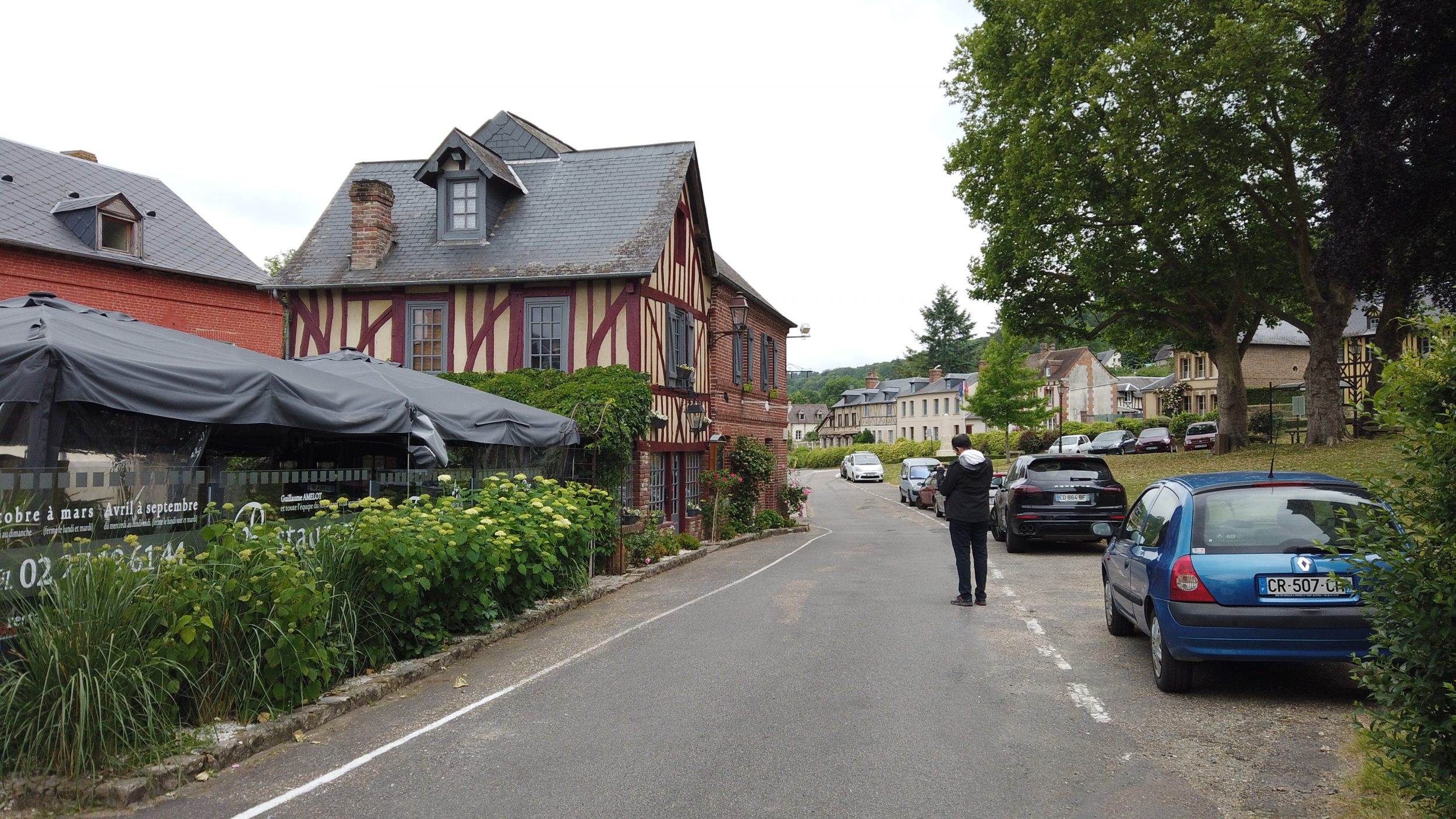 Ścieżka prowadząca do wsi jest już piękna, idziemy wzdłuż małego strumyka, zanim zaparkujemy tuż za kościołem. Te piękne domy z muru pruskiego typowe dla normańskich wiosek, zapowiada się ciekawa wizyta! Od otwarcia restauracji minęło zaledwie kilka dni, więc ruch dopiero się rozkręca, ale kwiaty są w pełnym rozkwicie i gotowe na przyjęcie turystów. Miejscowość ta jest również jednym z najbardziej ukwieconych miast i wsi we Francji.