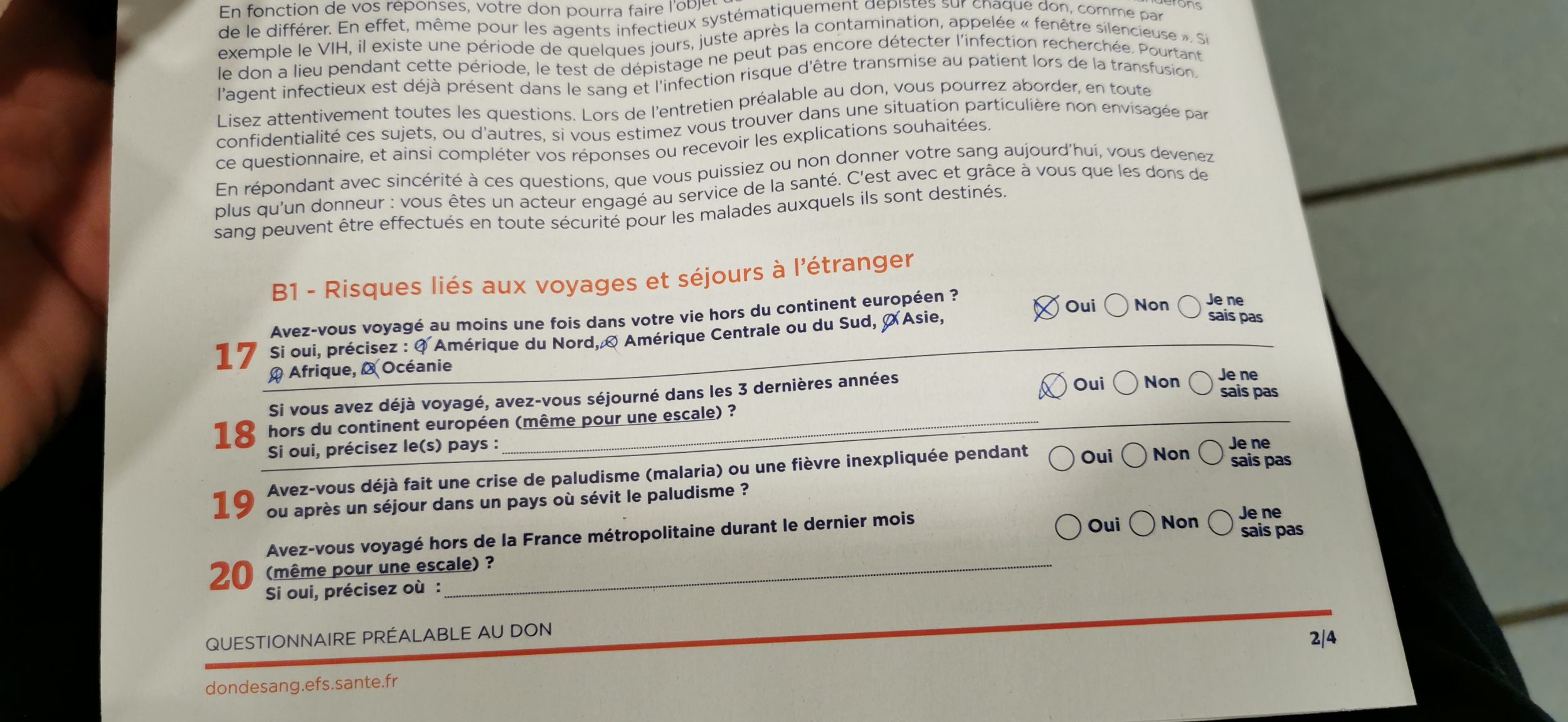 Jeśli chodzi o podróż, lekarz po prostu sprawdzi, czy data powrotu do Francji jest zgodna z datą oddania krwi (za pomocą tabeli, o której wspomniałam na początku artykułu). Ponieważ mieszkałem ponad 6 miesięcy w strefie malarii, moja krew będzie systematycznie badana na malarię (jest w moich aktach). Z moim ostatnim pobytem w Meksyku, chagas będzie również testowany.