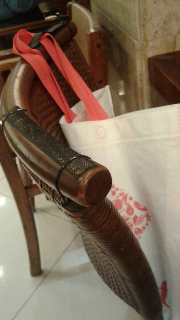 Kolejna rzecz, o której warto wspomnieć: rzepy na krzesłach, które „chronią” torbę przed złodziejami. Dołączyłam moją torbę na zakupy z Carrefoura (kupioną w Buenos Aires – czy to nie zabawne?)