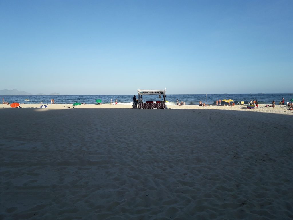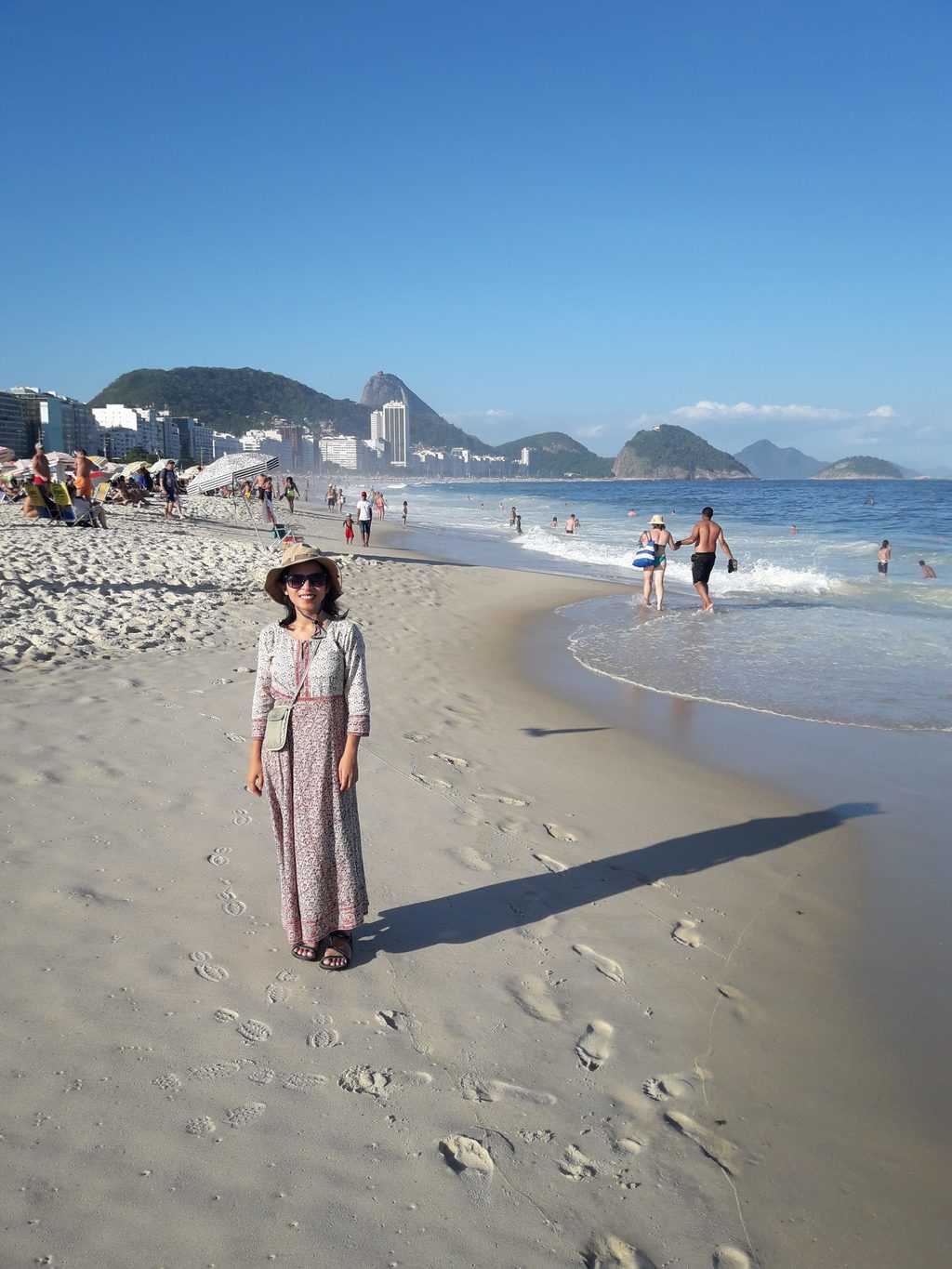 Plaża Copacabana jest poza moją wyobraźnią. To jest bardzo piękne! Wzdłuż promenady rośnie kilka palm, a drobny biały piasek jest bardzo przyjemny. Już kocham Rio de Janeiro! To takie miłe uczucie!