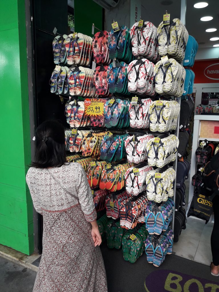 Po drodze do kantoru mijamy kilka sklepów Havaianas. Oficjalny sklep sprzedaje je za 33 reale, podczas gdy inne nieoficjalne sklepy mogą je sprzedać za 14 reali. Nie ma to nic wspólnego z cenami we Francji (18€ do 30€ za parę).