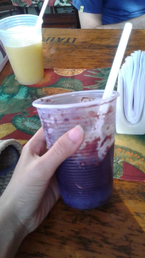 Zatrzymujemy się w restauracji sprzedającej coś w rodzaju „kartonowych” naleśników. Próbuję słynnego açai, czyli rodzaju smoothie z owoców açai. To jest jadalne!