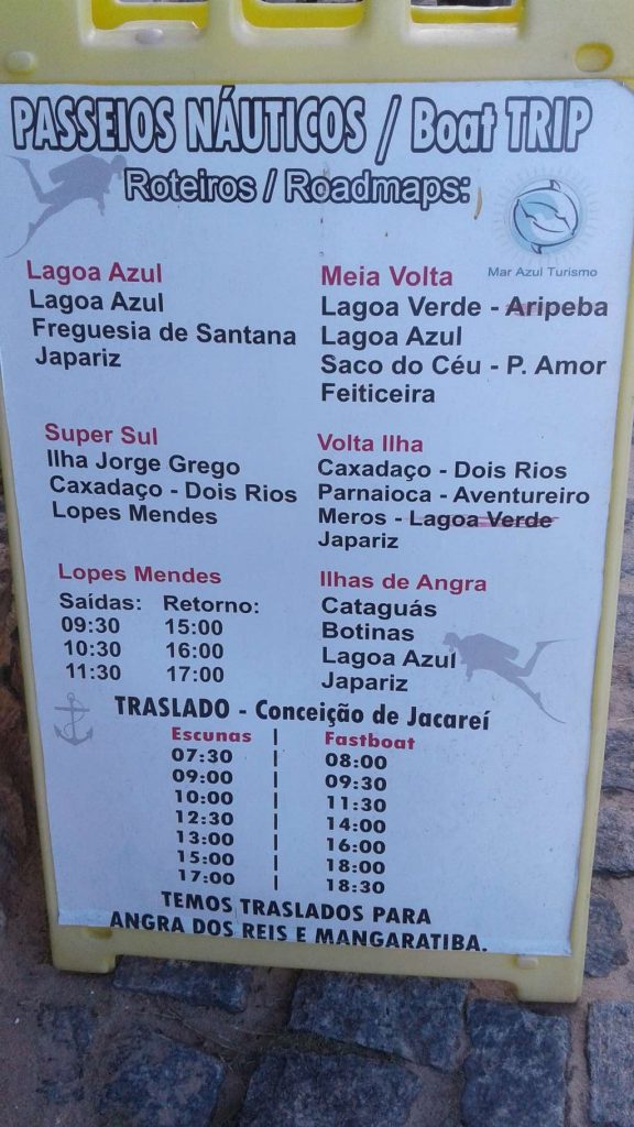 Autobus miejski podrzuca nas do portu w Angrze. Wszyscy idą do biura turystycznego, które informuje nas, że musimy przejść przez drogę i kupić bilet na łódkę w „Dolce Angra”, 50 reais. Nie wiem, co się stało, ale od czasu mojej alergii, rozumiem portugalski bardzo dobrze 😀