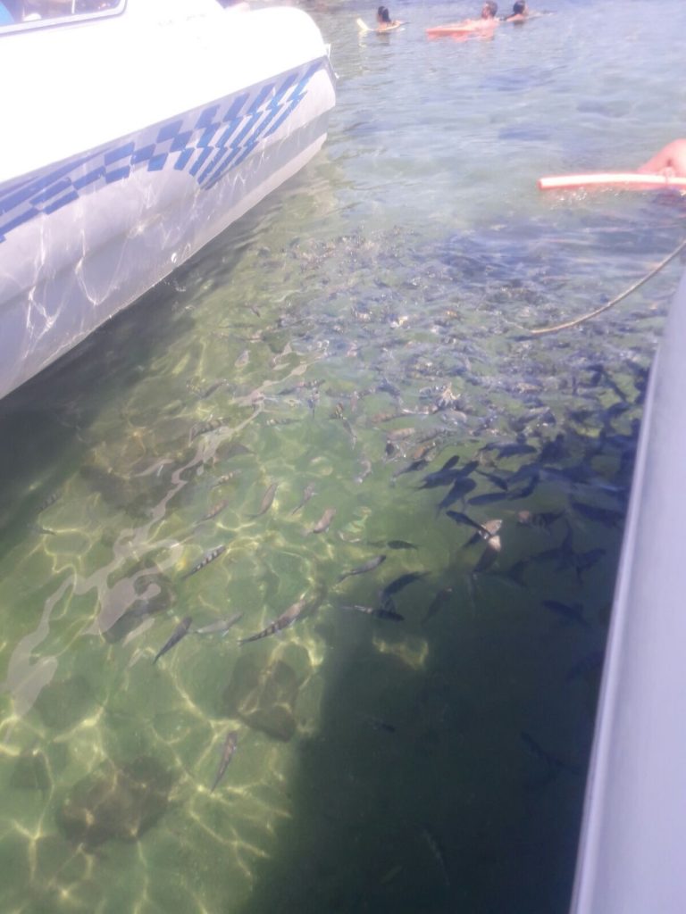 Ryb jest dużo, ale skupiają się wokół łodzi, ponieważ ludzie od czasu do czasu je dokarmiają. Ryby są mniej kolorowe niż na Filipinach, myślę, że mniej ładne