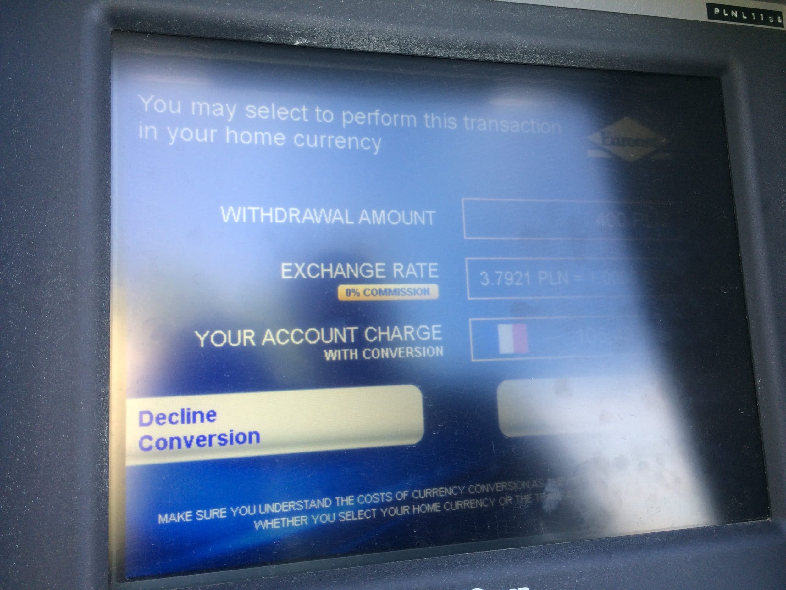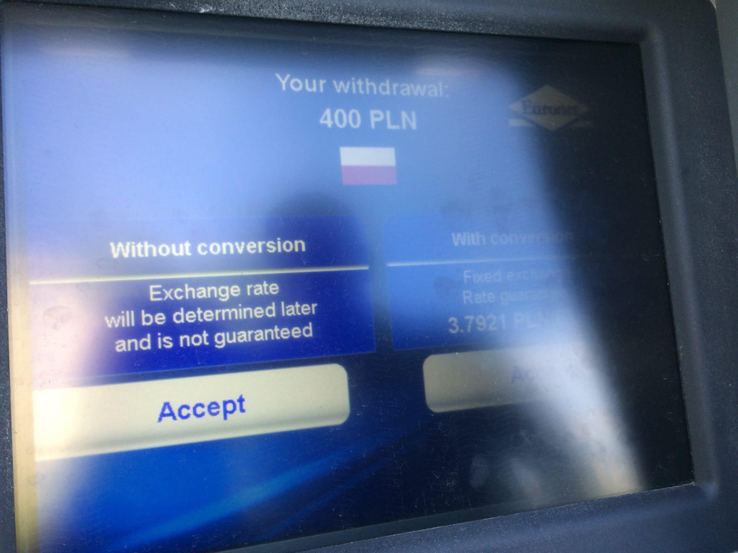 - Wypłacając pieniądze w dowolnym miejscu w Polsce, nie należy akceptować proponowanego kursu wymiany (który wynosi 3,79 zamiast 4,12). Wybierz opcję „Odrzuć konwersję”